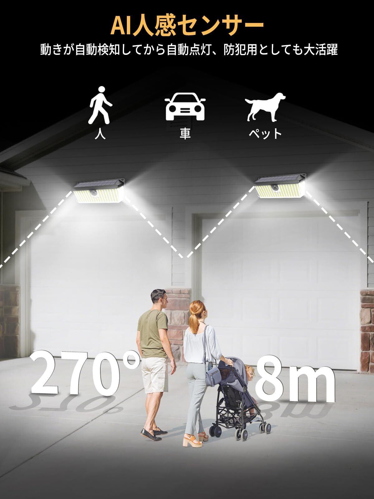【AI人感高感度センサー・自動点灯・消灯】この屋外 ソーラーライトは帰宅した瞬間に光がお出迎え!8m先から感知する高感度センサーライトは暗がりでふと足を止めた瞬間、人を感知して0.3秒で自動点灯。270°の広範囲&最大8m(他社比2倍以上)の検知性能で、「玄関までの小道」「物置の裏通り」も丸ごとカバー。お子様の夜間帰宅・ゴミ出し時の安全を強力サポート、家帰りに早く検知され、照らしてくれ、暗闇を恐れる人ご安心!