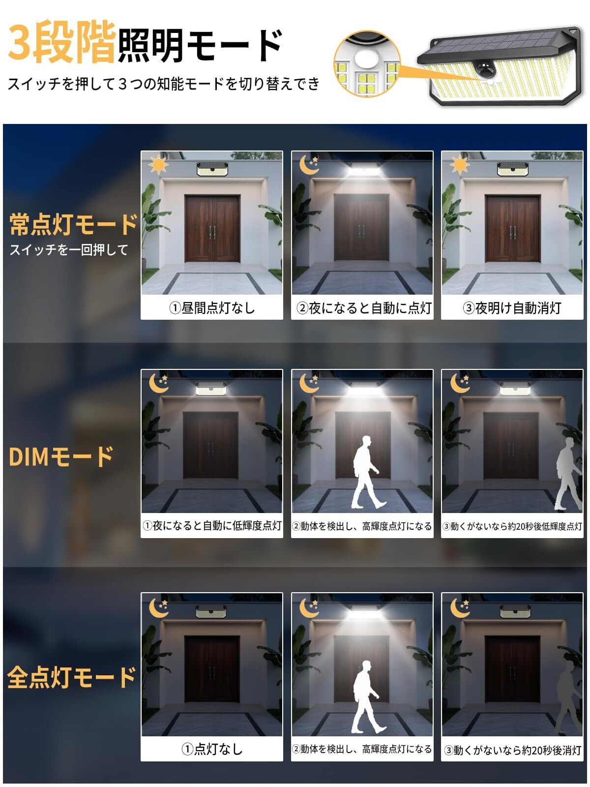 【3 つのモード】屋外用センサーソーラー ライトは、13 ~ 20 フィート以内、120 度の角度で動きを検知する PIR モーション センサーが搭載されています、ソーラーライトのボタンを一回目押すると【常時点灯モード】になる:夜または暗くなると自動的に中程度の明るさで点灯します。二回目ボタンを押しすると【DIMモード】になる:夜や暗くなると、自動的に弱光点灯します。 動きを検知すると、25秒間100%の明るさで点灯し、再び暗くなります。三回目ボタンを押しすると【強光センサーモード】になる:夜間に動きを検知すると、100%の明るさで25秒間点灯し続け、その後自動的に消灯します。当社の屋外センサー ライトは、人、動物、車の動きを検知します。通行人が前庭を通過すると、ライトが検知して点灯し、通行人の道を照らし、他の人に便利です。動物や部外者が庭に侵入すると、ライトが警告として点灯し、庭の安全性が向上します。