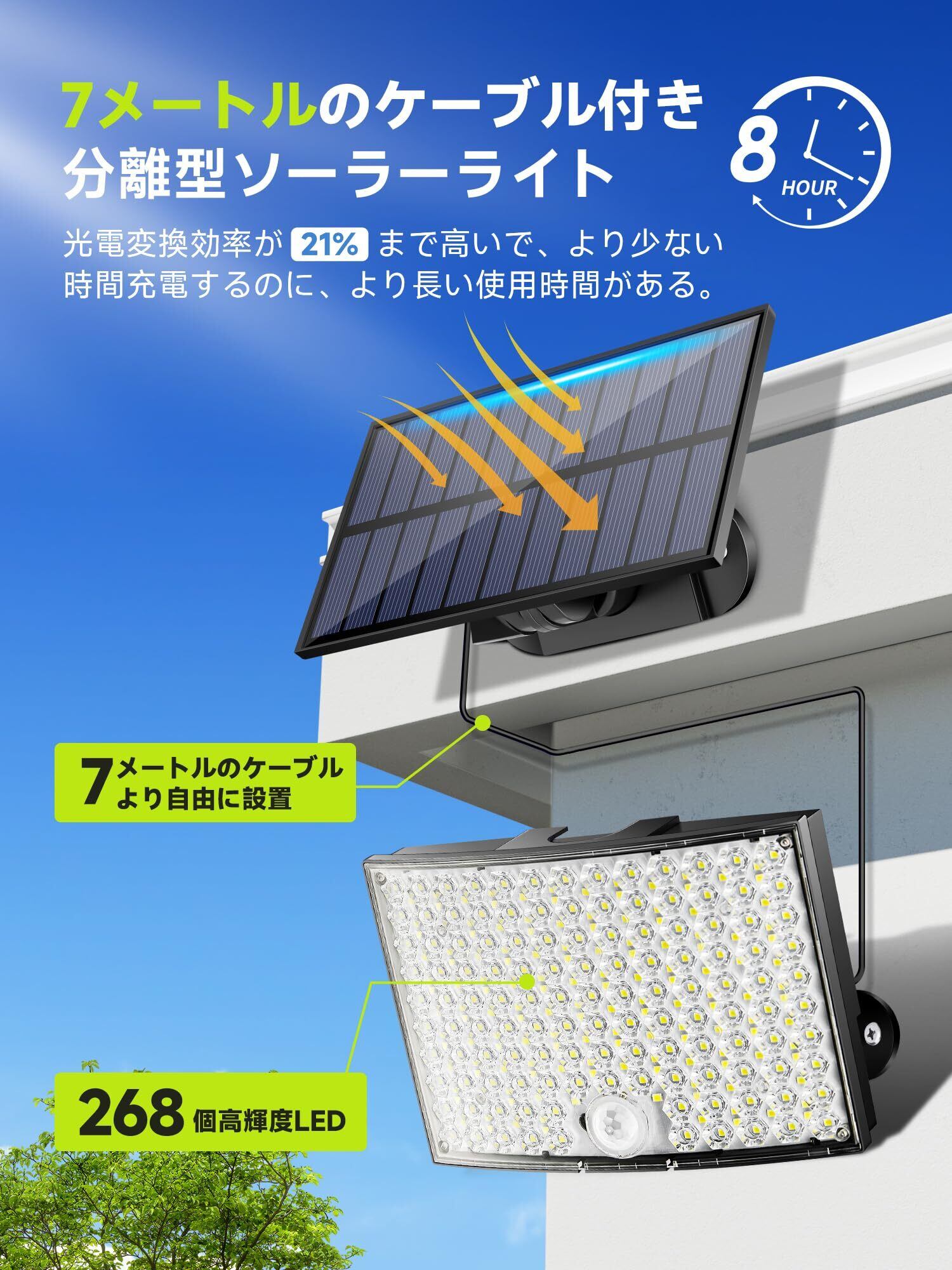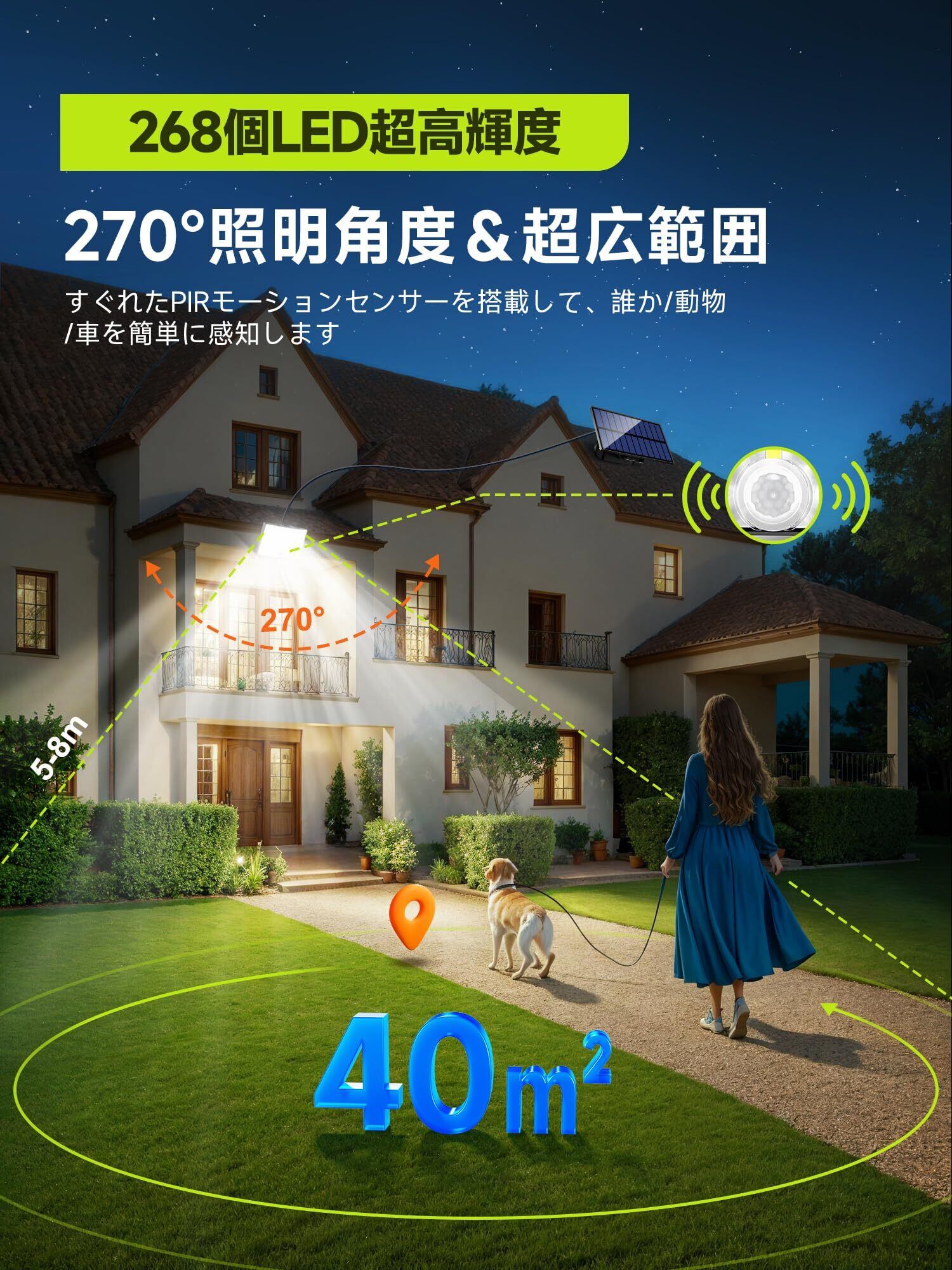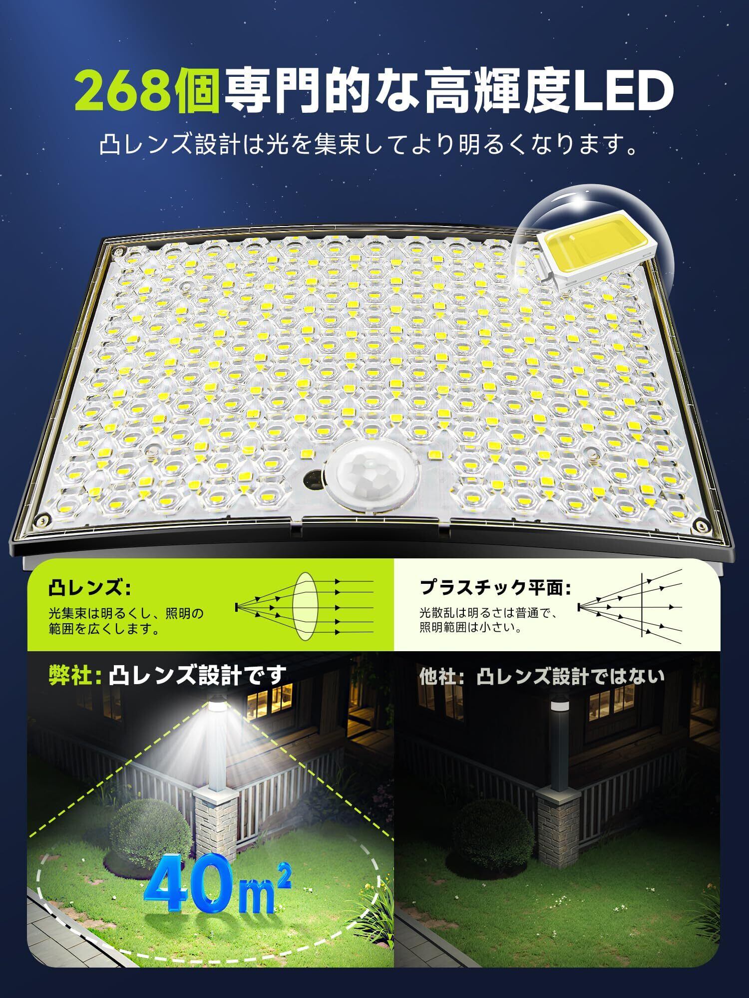 【3000ルーメン超高輝度&7M延長コード付きの分離型ソーラーライト】268個の高品質なLEDがあるソーラーセンサーライトは3000ルーメンの超高輝度に達することができます。ほかのソーラーライト屋外と比べて、弊店の分離型の屋外センサーライトは7メートルケーブルを備えます。それで、弊店のじんかんせんさーライト屋外は設置範囲がもっと広くて、充電がもっと便利です。ソーラーセンサーライトと人感センサーライト屋外は270°の広角照明が可能で、12坪数までの範囲を照らすことができます。凸レンズのデザインなので、センサーライト屋外とソーラーライト屋外は光を集束してより明るく、より均一に分布した光で照らします。屋外ledセンサーライトは広角照明により、照明利用率を高め、夜間の安全を確保することができます。防犯ライト、屋外ソーラーライト、防犯灯、屋外ライト、外灯、屋外照明として、玄関、軒先、庭、廊下、ガーデン、ベランダ、駐車場など場合に大活躍!