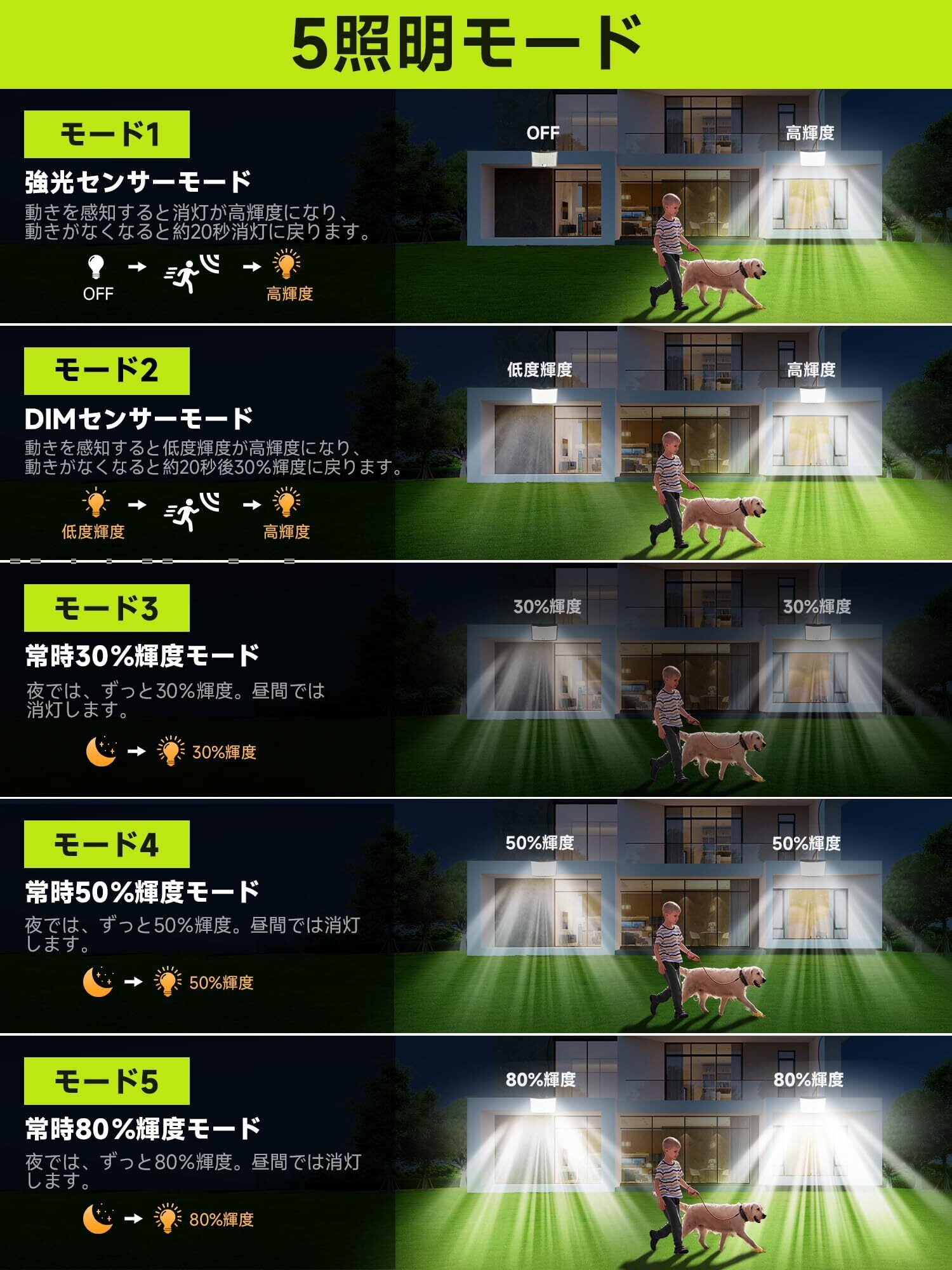 【五つのセンサー照明モード】昇級版ソーラーセンサーライトは明暗センサー検知器と人感センサー検知器を搭載され、五つのセンサー照明モードがあります。①強光センサーモード:夜や暗くなると、人感センサーライト屋外は動きを感知し、自動的に高輝度点灯になって、動きがなくなると約20秒後消灯になります。②DIMセンサーモード:夜や暗くなると、屋外センサーライトは自動的に低度輝度で点灯します。人や動物の動きを感知すると、屋外センサーライトは自動的に高輝度で点灯になって、動きがなくなると約20秒後低度輝度で点灯状態に戻ります。③常時30%輝度モード:夜や暗くなると、ソーラーライト屋外は自動的に30%輝度で点灯しています。昼間と明るい場所では消灯します。④常時50%輝度モード:夜や暗くなると、ソーラーライト屋外は自動的に50%輝度で点灯しています。昼間と明るい場所では消灯します。⑤常時80%輝度モード:夜や暗くなると、ソーラーライト屋外は自動的に80%輝度で点灯しています。昼間と明るい場所では消灯します。
