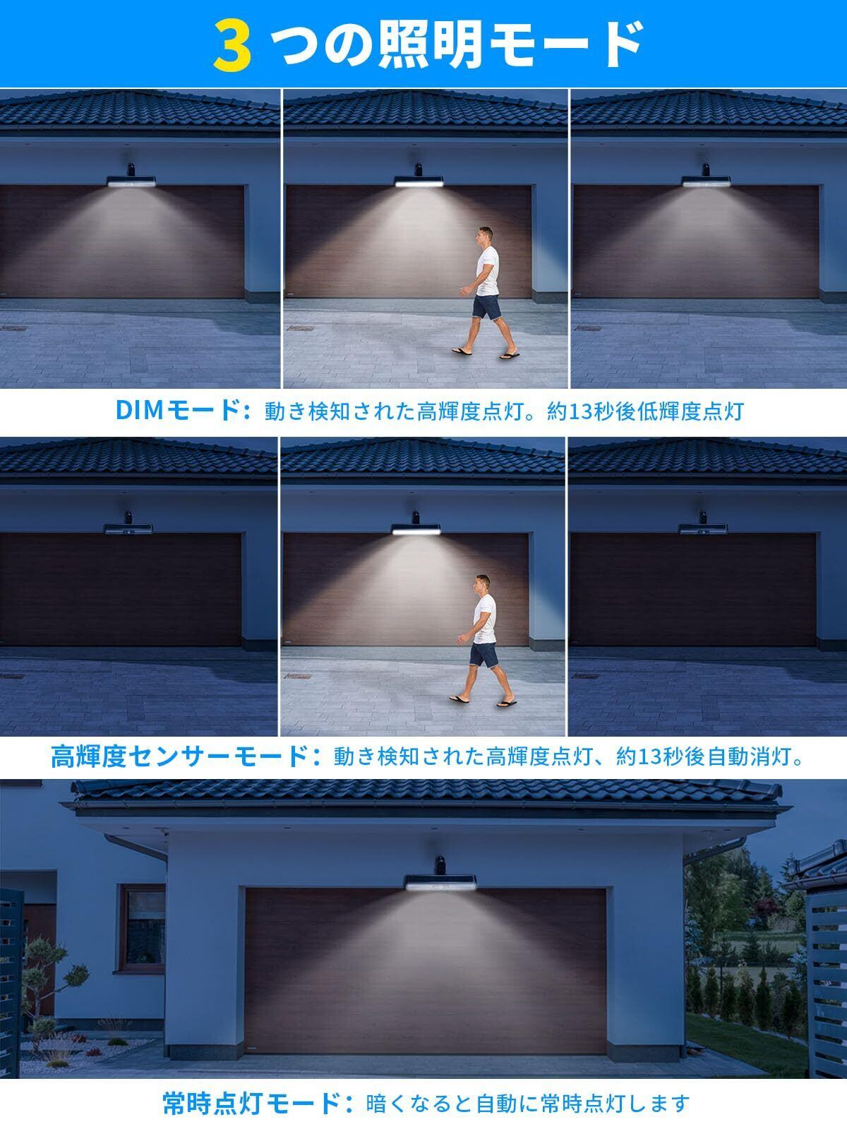 【3つ点灯モード】じんかんせんさー ライト 屋外は高輝度センサーモード、DIMモード、常時ライトモード3つの知能点灯モードが搭載されます。スイッチを一回目押すると「DIMモード」:夜に動き検知された高輝度点灯、約13秒後低輝度点灯します。二回目スイッチを押しすると「高輝度センサーモード」になる:夜や暗くなると、動き検知された高輝度点灯、約13秒後自動消灯します。三回目スイッチを押しすると「常時点灯モード」になる:暗くなると自動に常時点灯します。