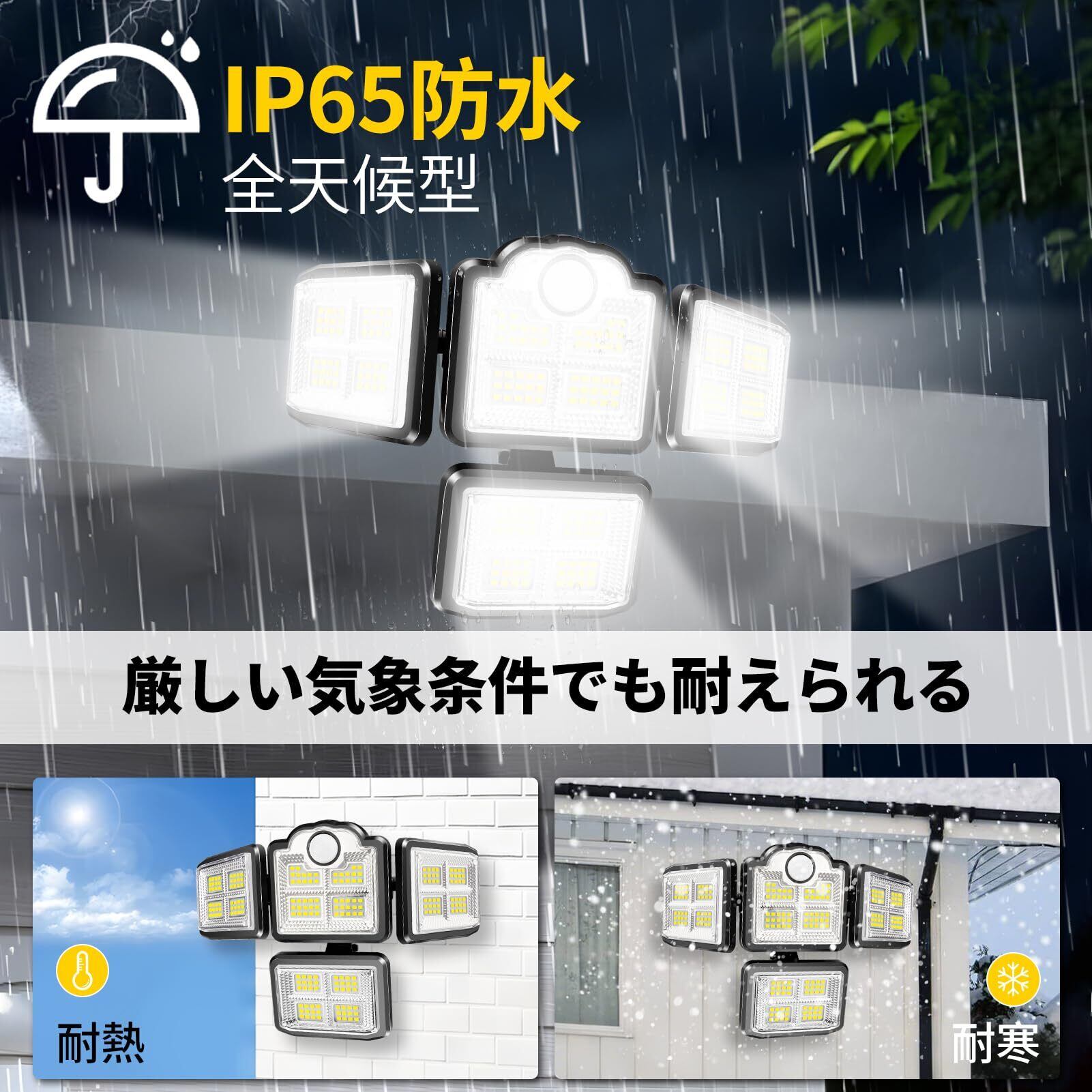 1.発電量1.8W:発電量の多い方は、日照が少ない曇りの日や、朝夕の弱い光でも効果的に発電でき、充電時間も短縮できます(最大充満時間4-6時間)。2.大容量電池2400mAh:満電最大照明時間は8-10時間、点灯回数に替えば約400回点灯できます。3.昼光色6000k超高輝度3000ルーメンのLEDチップを搭載します(照明範囲は最大20畳)。4.高感度の人感+光感PIR動体検知センサーを搭載します(感知範囲は最大12.5畳)。