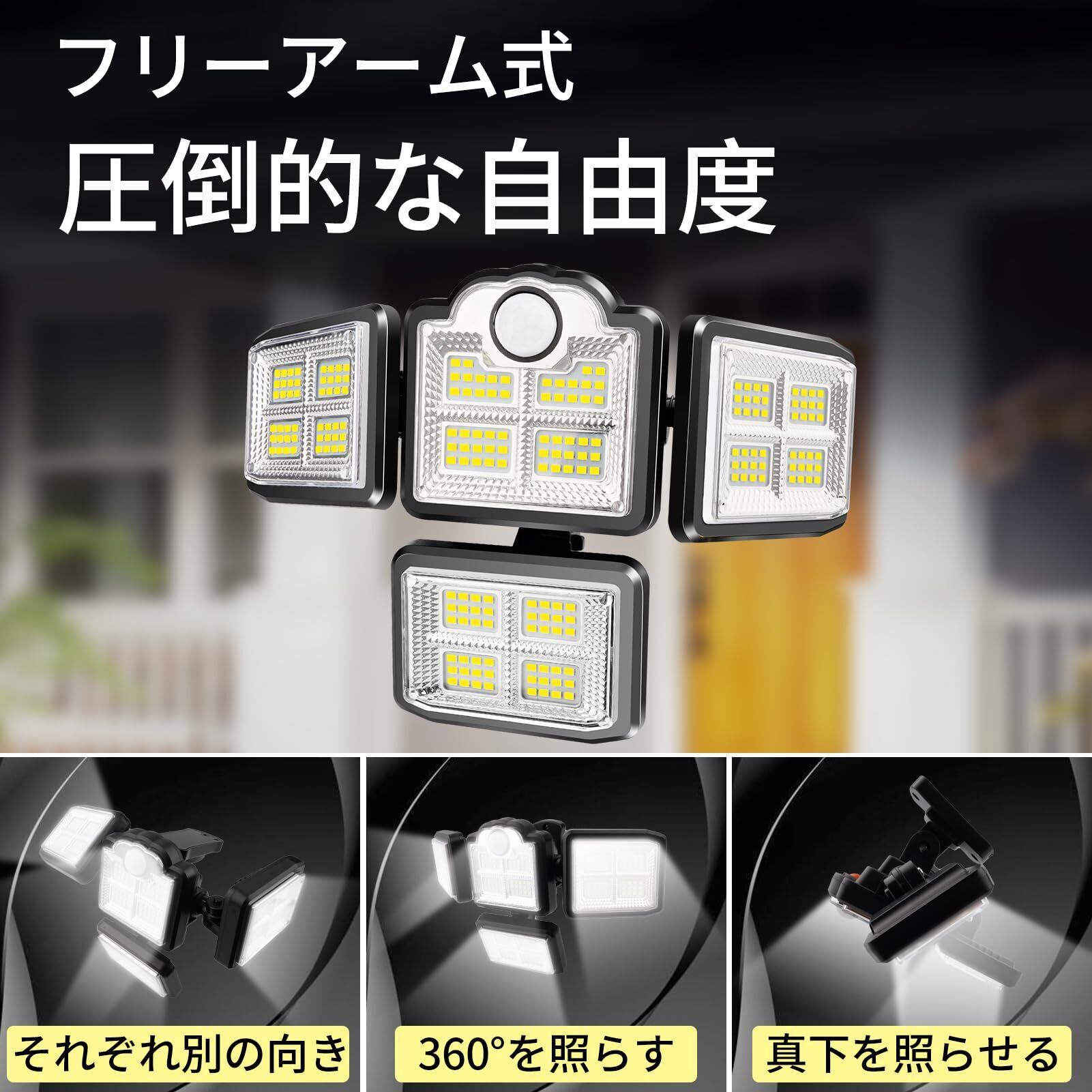 【分離型の設置方法】連結設置:5mの高品質ケーブル付きで、取り付け簡単。付属のネジでソーラーランプを壁に取り付け、ソーラーパネルを日当たりの良い場所に取り付けます。理想的な取り付け高さは約2.5mです。【フリーアーム式 圧倒的な自由度】各パネルは上下左右に自由に回転可能で、必要な方向だけに光を調整できる柔軟な設計です。
