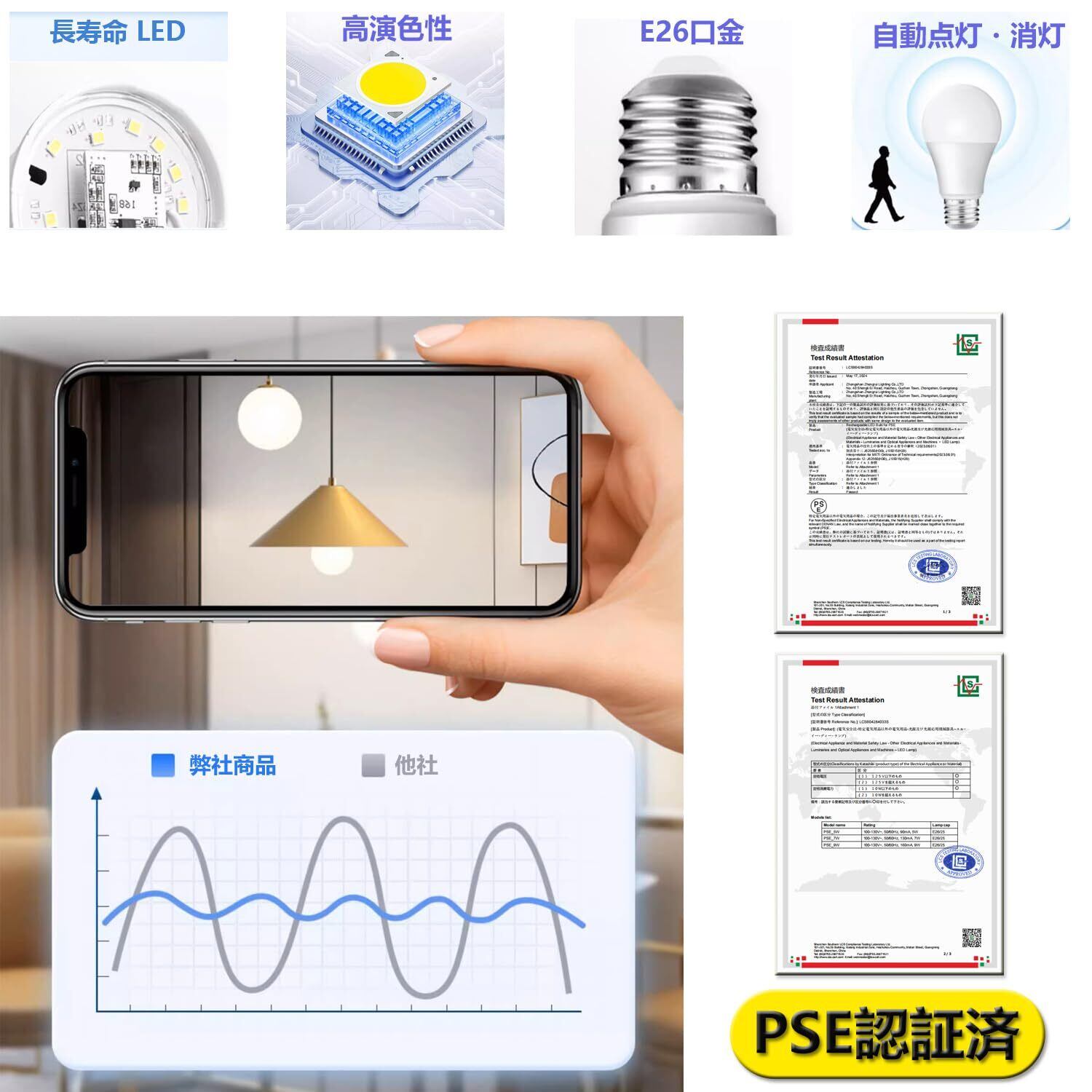 【高演色性&長寿命&PSE認証済】演色評価数は82+、物の本当の色を復元できる上に、電球色は暖かい色を演出でき、リラックス効果が得られます。そして、設計寿命は約15000hで、長く使用することができます。 【PSE認証済】日本政府が定める電気用品安全法(PSE)の安全基準に適合した認証済の製品です。(電気用品安全法 製造・輸入事業者)
