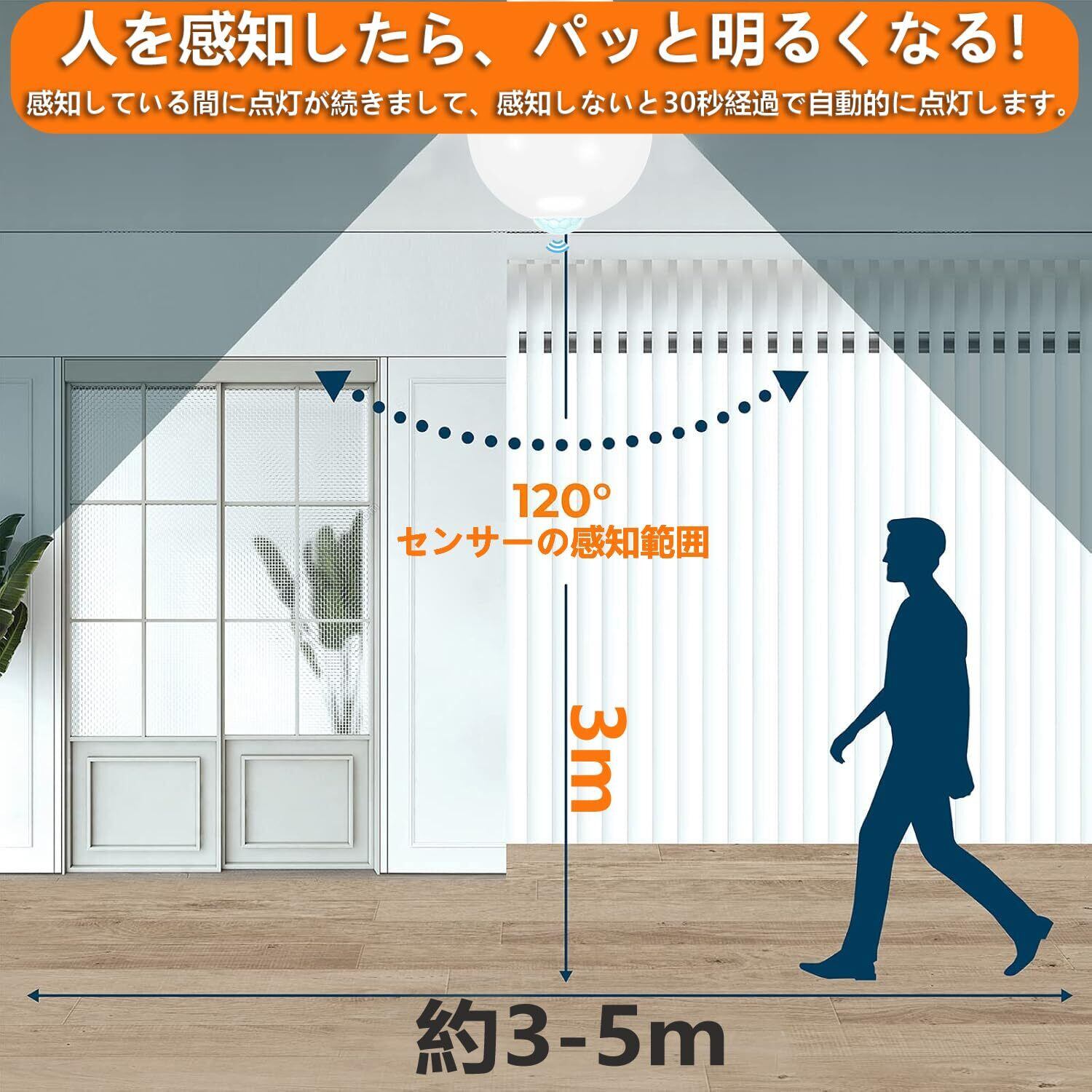 【自動点灯・消灯】周囲が暗くなったとき、人が近くにいると、ライトは自動的に30秒間点灯します。もしその間に誰もいなくなると、30秒後にライトは消えます。(※注意:壁のスイッチをオンにした後、ライトはすぐに点灯し、30 秒後に消灯し、待機状態になります。使用中は壁のスイッチをONの状態にしておいてください)