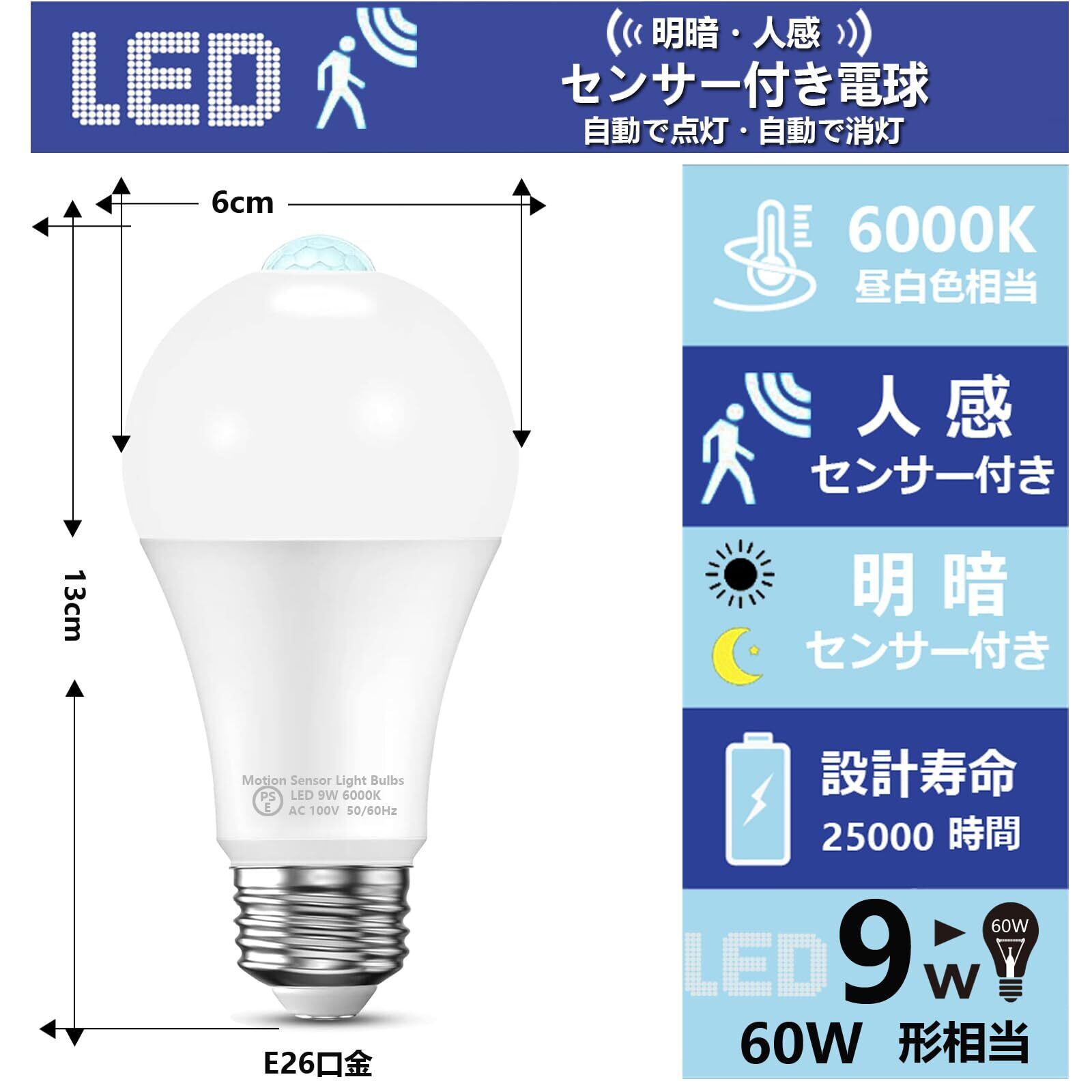 【商品仕樣】 口金:E26 、定格消費電力:9W、検知角度:約120°、検知範囲:直径約3-5m、電球サイズ:直径60mmx高さ127mm、定格電圧:AC100V 50/60Hz、色温度:6000K(昼光色)、全光束:900lm、演色性:82+、人感センサー/明暗センサー付き、非調光タイプ。