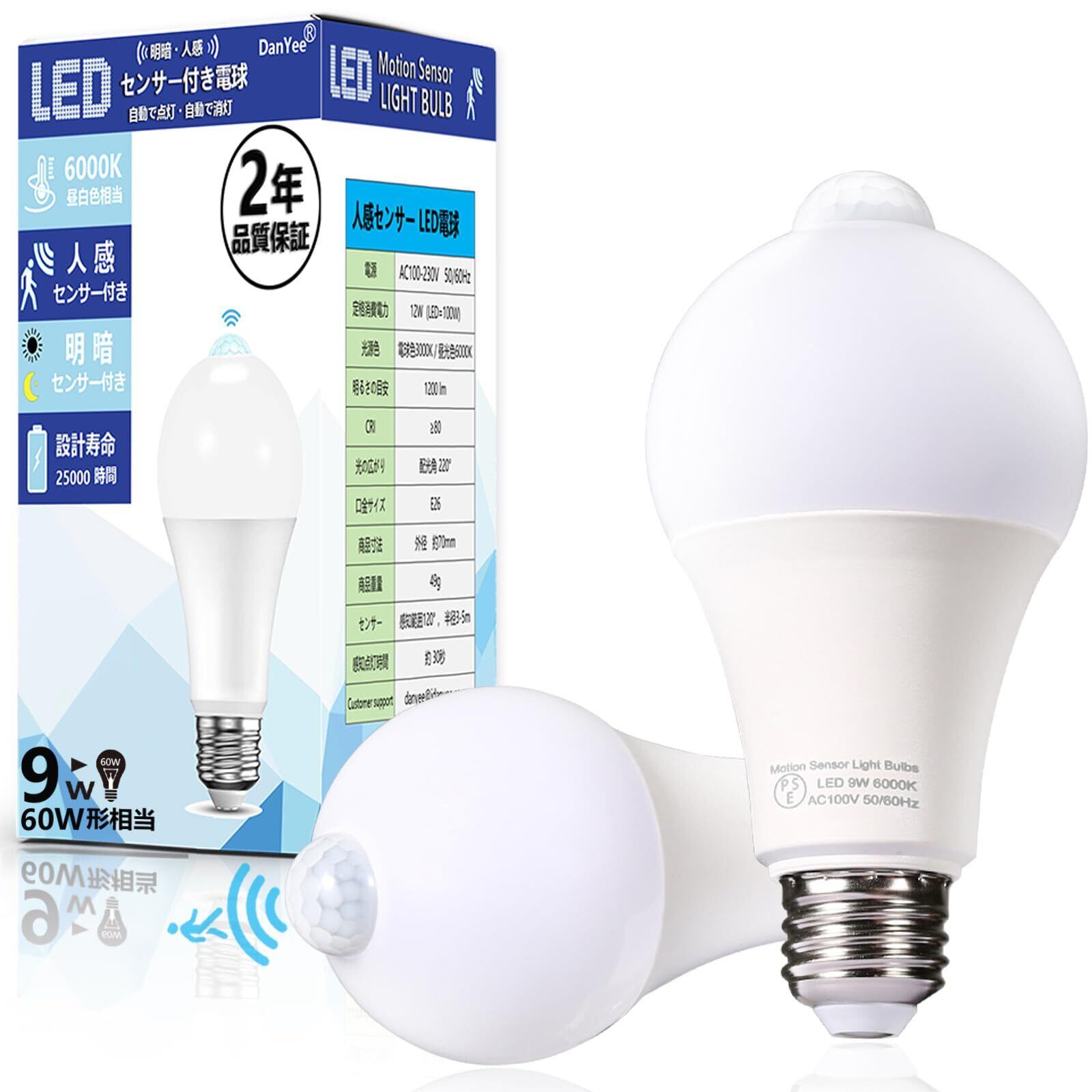 DanYee LED電球 人感センサー E26口金 9W 【2個・2年】 明暗センサー付き 自動点灯・消灯 昼光色 6000K 900lm 60W形相当 非調光 消し忘れ防止 階段 玄関 廊下 トイレ (9W昼白色【2個セット】) | KSショップ