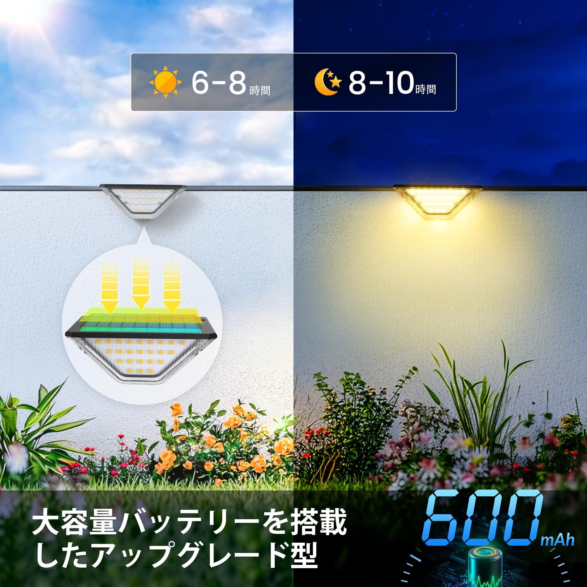 【自動充電、自動照明】:ソーラーライトはライトセンサーを搭載し、日中および良好な光条件の下では充電、夜になると自動点灯。周囲の環境の光度を自動的に検出でき、93%の効率と太陽エネルギーの高速貯蔵を備えています。夜間または暗い環境に置いては輝きます。on/offのスイッチなし、毎日自分で点灯する面倒を省きます。 内蔵バッテリーで点灯時間長い。帰宅の場合、遠くから道がライトアップされているのを見えます。