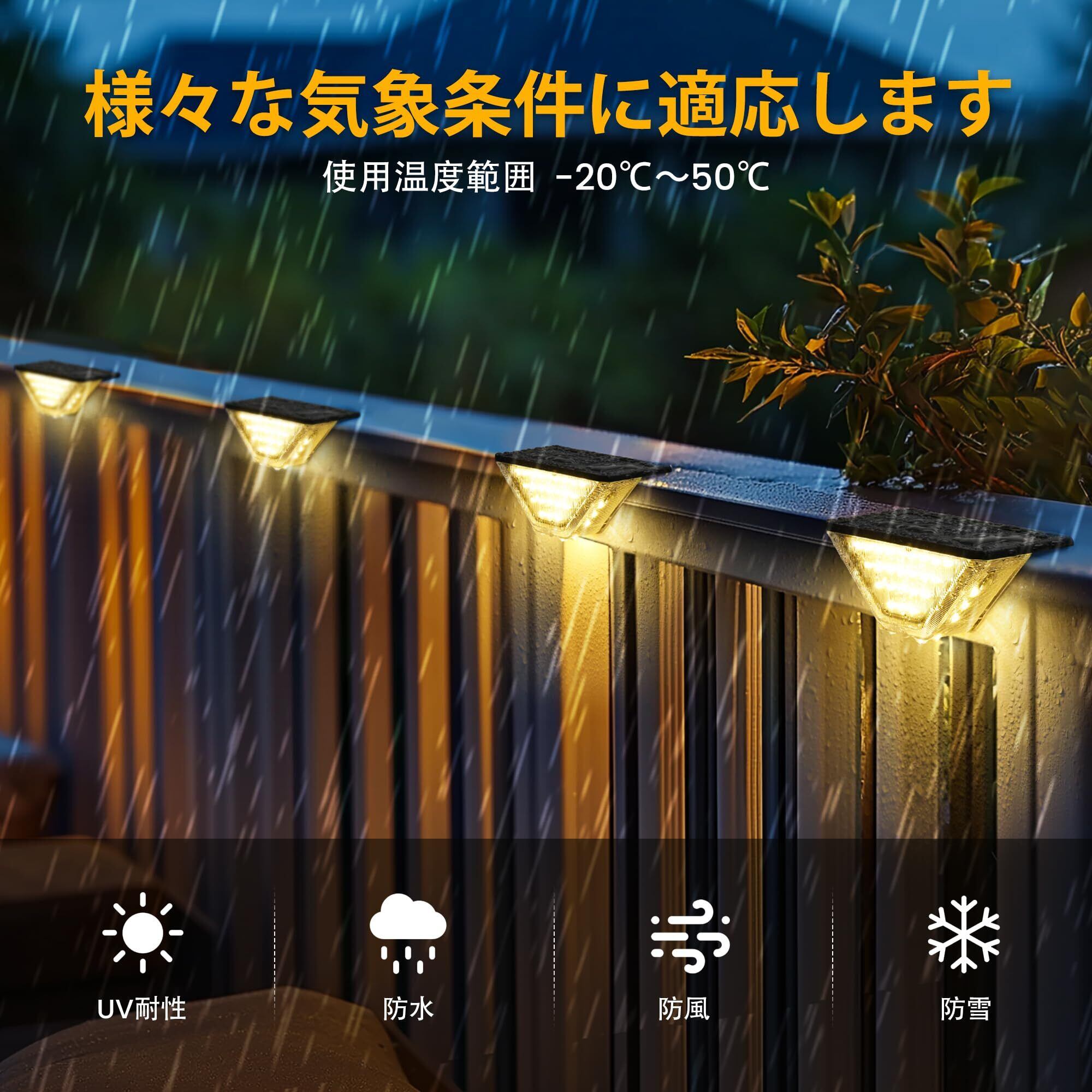 【暖色光、温かみのある雰囲気】:ソーラーデッキライトは夜間に綺麗に階段、玄関前、フェンス、ガーデンを照らし、暖かくてリラックスした気分を与え、快適な環境を作り出します。暖色系光を採用するソーラーライトはオレンジっぽい暖色ライトが精神的に最大程度でリラックスさせ、暖かい雰囲気や落ち着いた安心できる家を作り出します。また、垣根、デッキ、階段、テラス、ベランダ、庭や庭を照らすのに十分です。