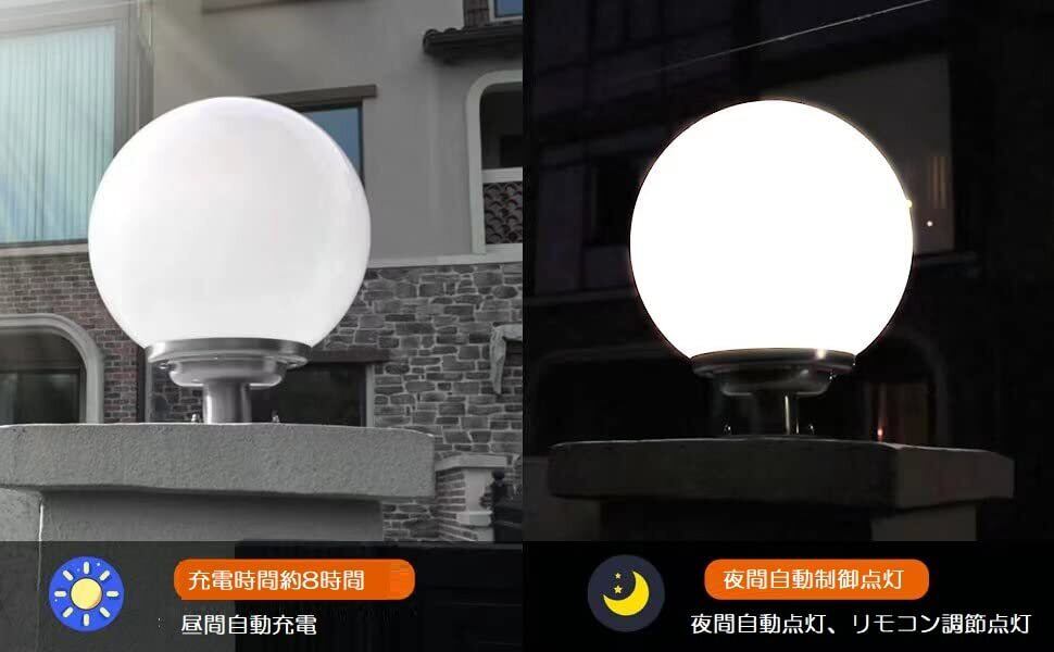 【商品仕様】直径25㎝ボール内蔵:単結晶ソーラーパネル、リチウムイオン18650充電池3.7V/2000mAh充電池、ホワイト色・電球色LED、防水:IP66、付属品:リモコン·(AAA単4形乾電池×2個)、取付けパーツ(ネジ、プラグ)質量:約795g、材質:PMMA、ステンレス