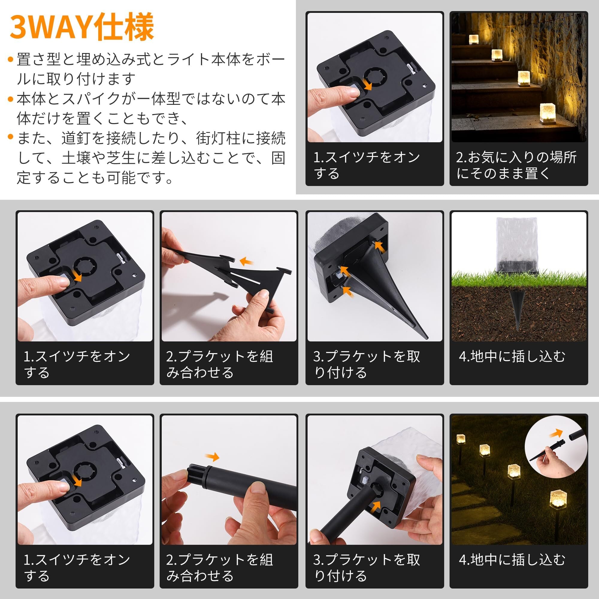 【ソーラーライト 屋外 防水】当社のソーラーライトは、真の国際防水規格IP68に適合し、大雨や雪などの悪天候にも耐えられます。埋め込み式ソーラーライトは動作温度は-10℃~50℃になり、一年中屋外でご使用いただけます。独特な水紋のランプシェード カバーがソーラーパネルや周りのLEDの上にかぶさっており、防水性や高級感を高めております。このガーデンライトでお庭がおしゃれと輝きに変身!