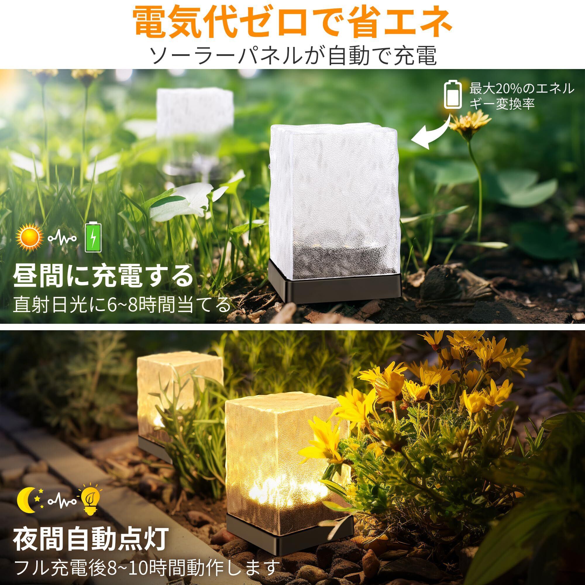 【太陽光発電パネル・長い作業時間】ガーデンライトは内蔵600mAhの大容量バッテリーにより、太陽光を効率的に収集できます。そのため、6~8時間のフル充電後、連続的な照明を8~10時間提供することができます。本製品のソーラーライトを直射日光の下に置いて下さい。※木の下と軒下に置くと、充電できないかもしれません。