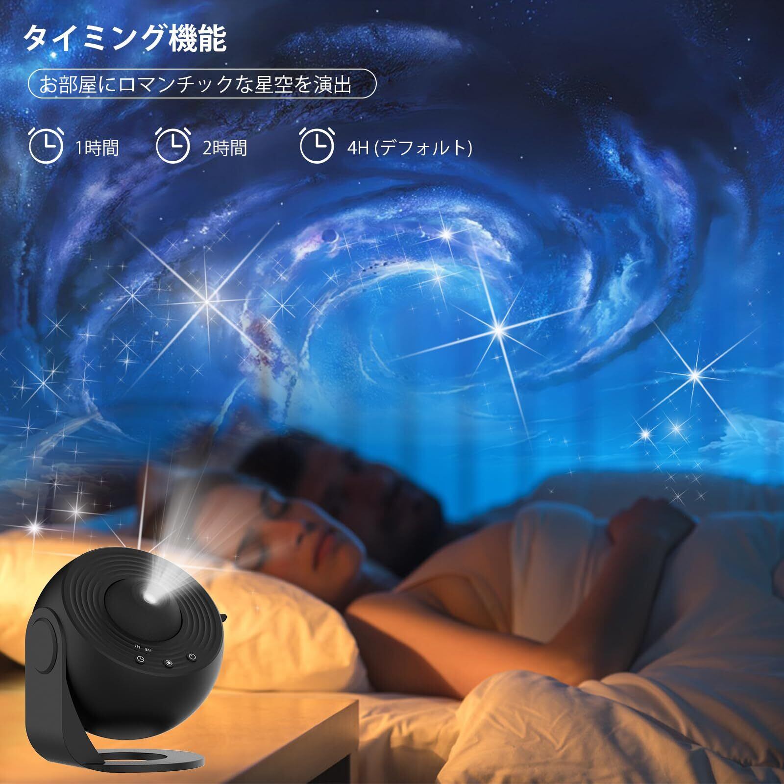 調整可能な光と時間設定と広いカバーエリア:ギャラクシーライトは、135〜754平方フィートのカバーエリアで、最大4.4フィート離れた壁、床、天井に星や太陽系を投影できます。このスタープロジェクターは 360° 回転と回転フィルム ディスク ボタンを備えており、没入感を生み出します。
