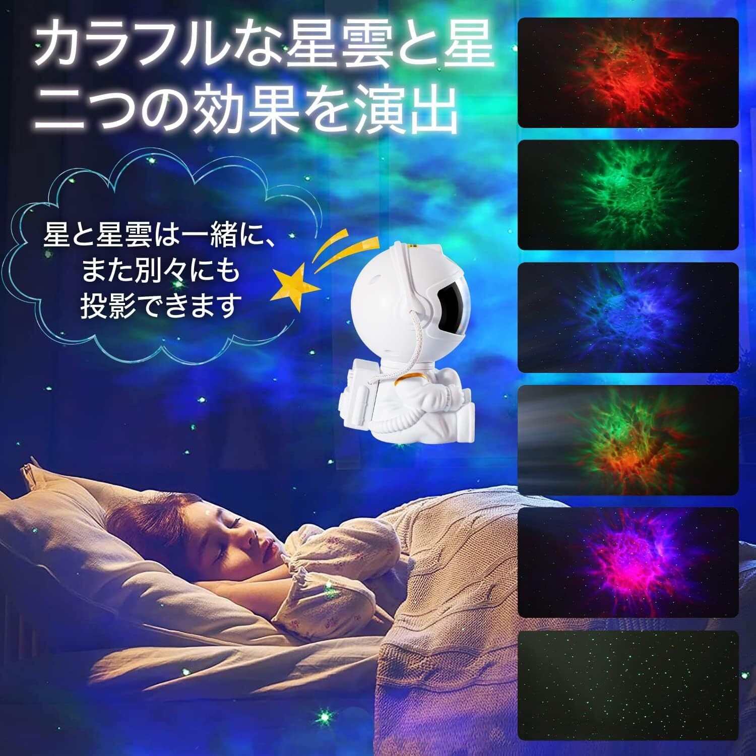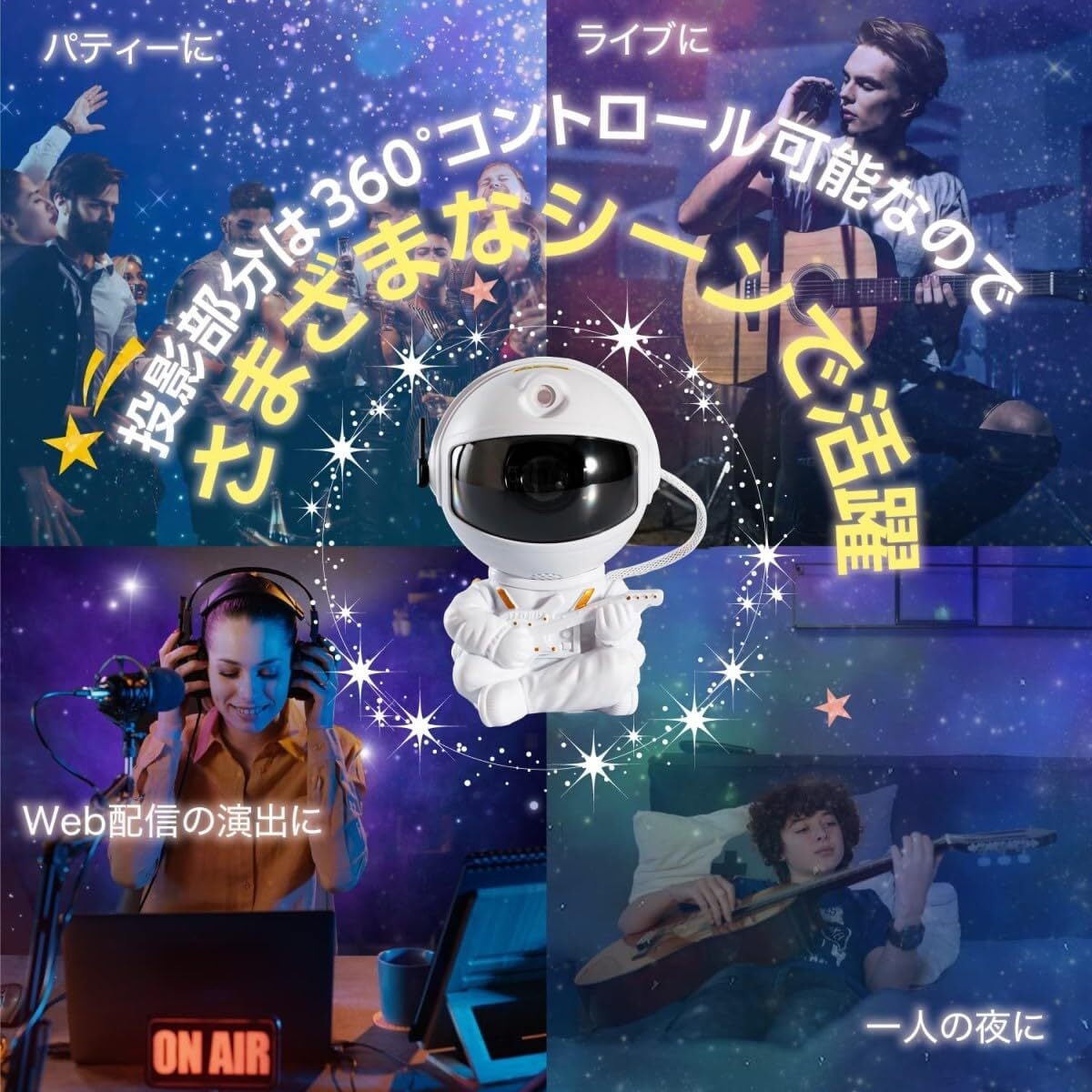 【ユニークなデザイン】かわいい宇宙飛行士型のプロジェクターランプ。宇宙空間の美しさを再現したLEDライトです。手軽に夜空を感じられるための商品として、きらめく緑色の星とともに、数パターンの星雲エフェクトを楽しむことができます。子供から大人まで楽しめます。平和でリラックスした雰囲気を作り出します。ムービーナイト、デートナイト、またはゲームセットアップに最適な環境ライトです。