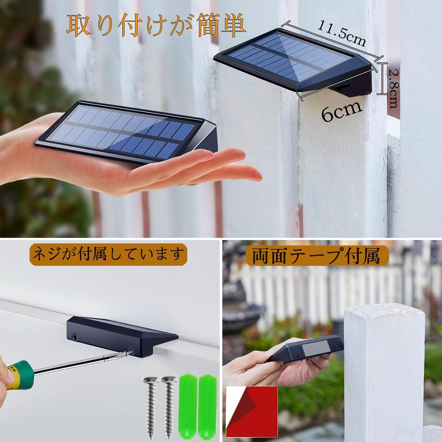 4.高品質単結晶ソーラーパネルを使用して、 パネル寸法6*11.4cmで、普通のソーラーフェンスライトより大きいから、充電スピードは速くで、点灯時間はもっと長いで、特に、悪天候は点灯時間ももっと長いです。明るさセンサーによる、ライト点灯と消灯を自動することができます。夕暮れから明け方までは自動的に点灯し、昼間になると自動的に消灯します。