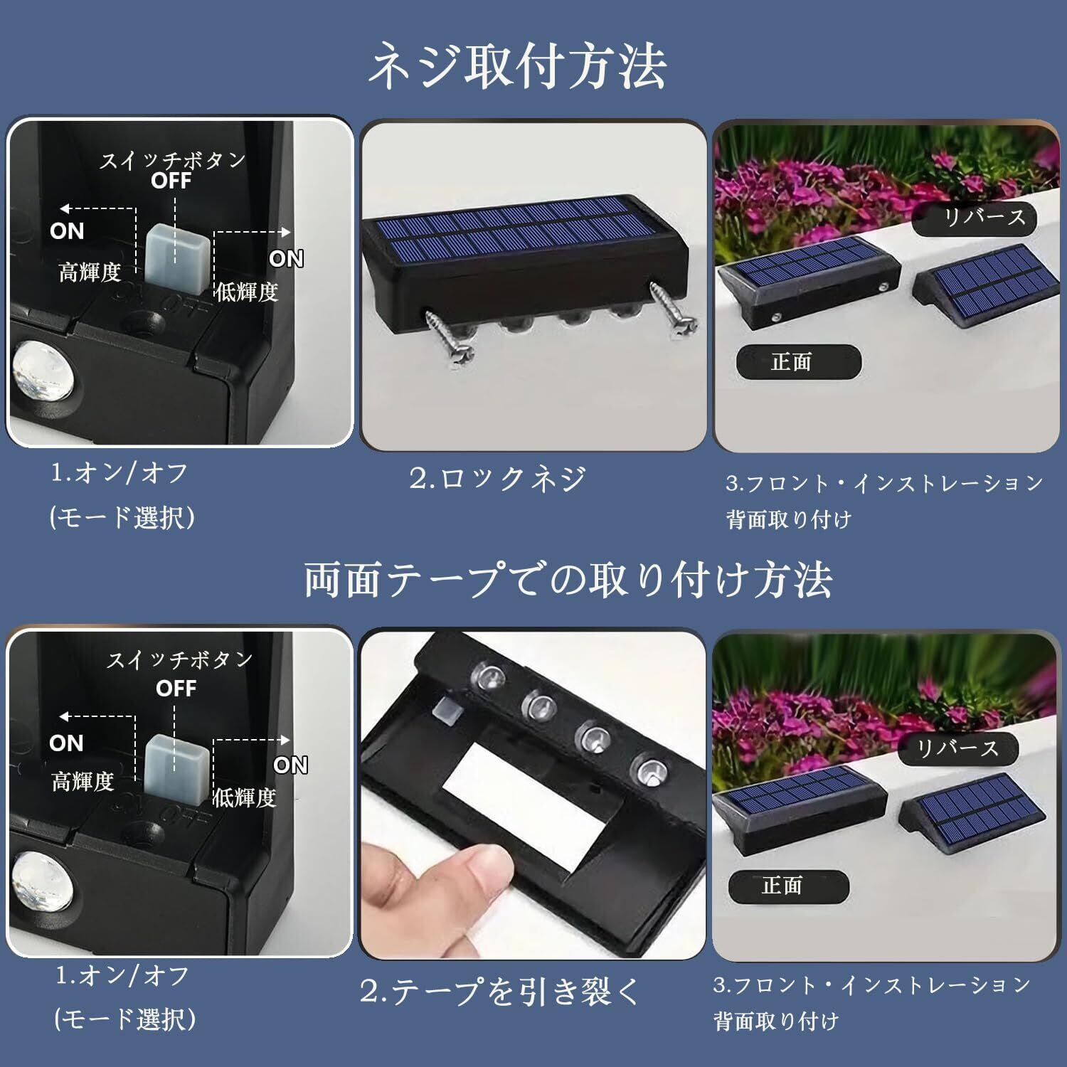 2.ソーラー充電・配線不要・電気代ゼロ:太陽光で充電できるので電気代がかかりません。 800mAhの大容量充電池(実測値800mAH、理論値1000mAH)を採用し、8時間の充電で10-12時間点灯可能です。雨の日は充電時間が長くなる場合があります。