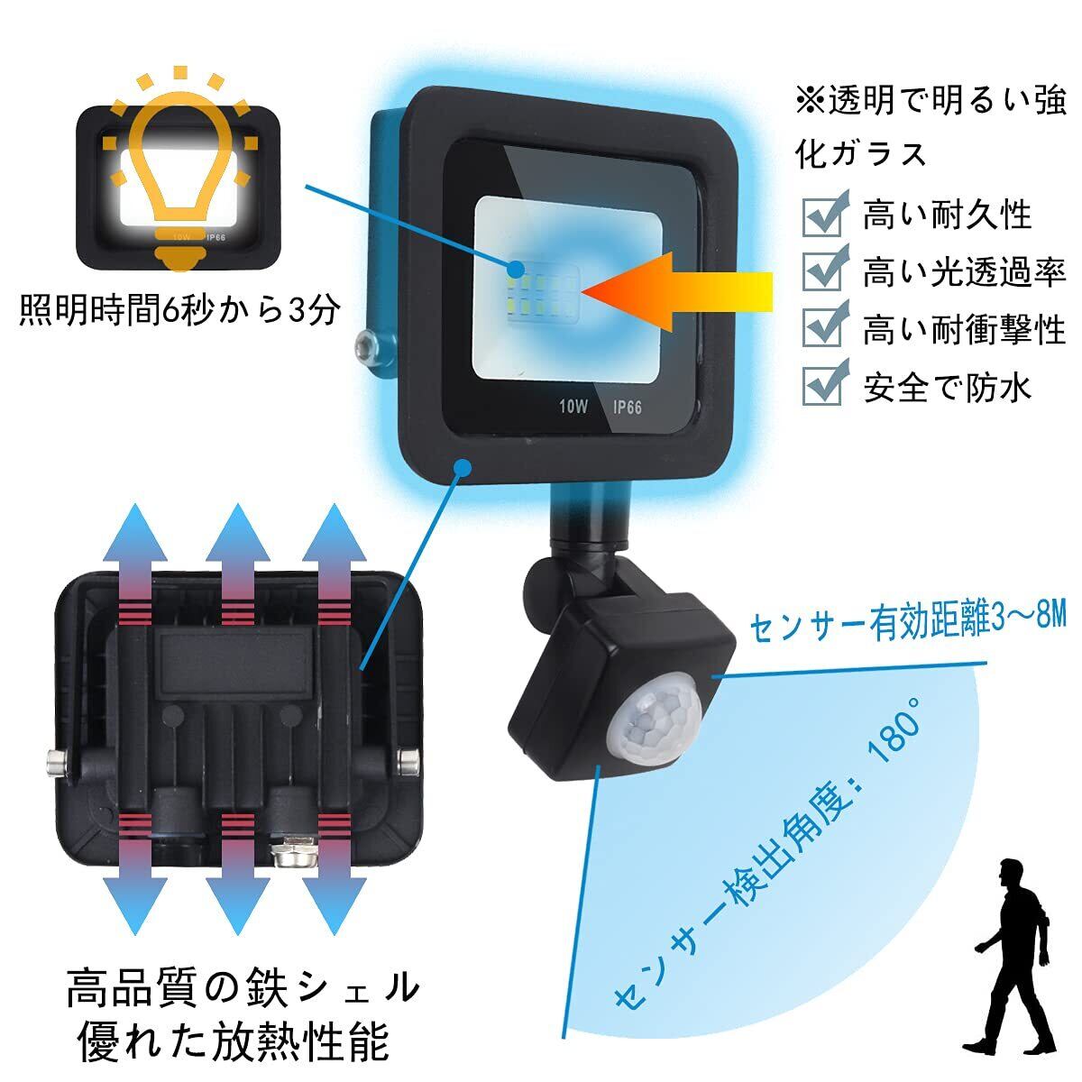 【LED 投光器 超薄型 製品パラメータ】消費電圧:AC110V 50/60Hz、重量:450g、光束値:1000Lm、発光効率:100lm / W、色温度:6000K(昼白色光)、電力:10W、最大検出距離 :6m;照明角度:120°