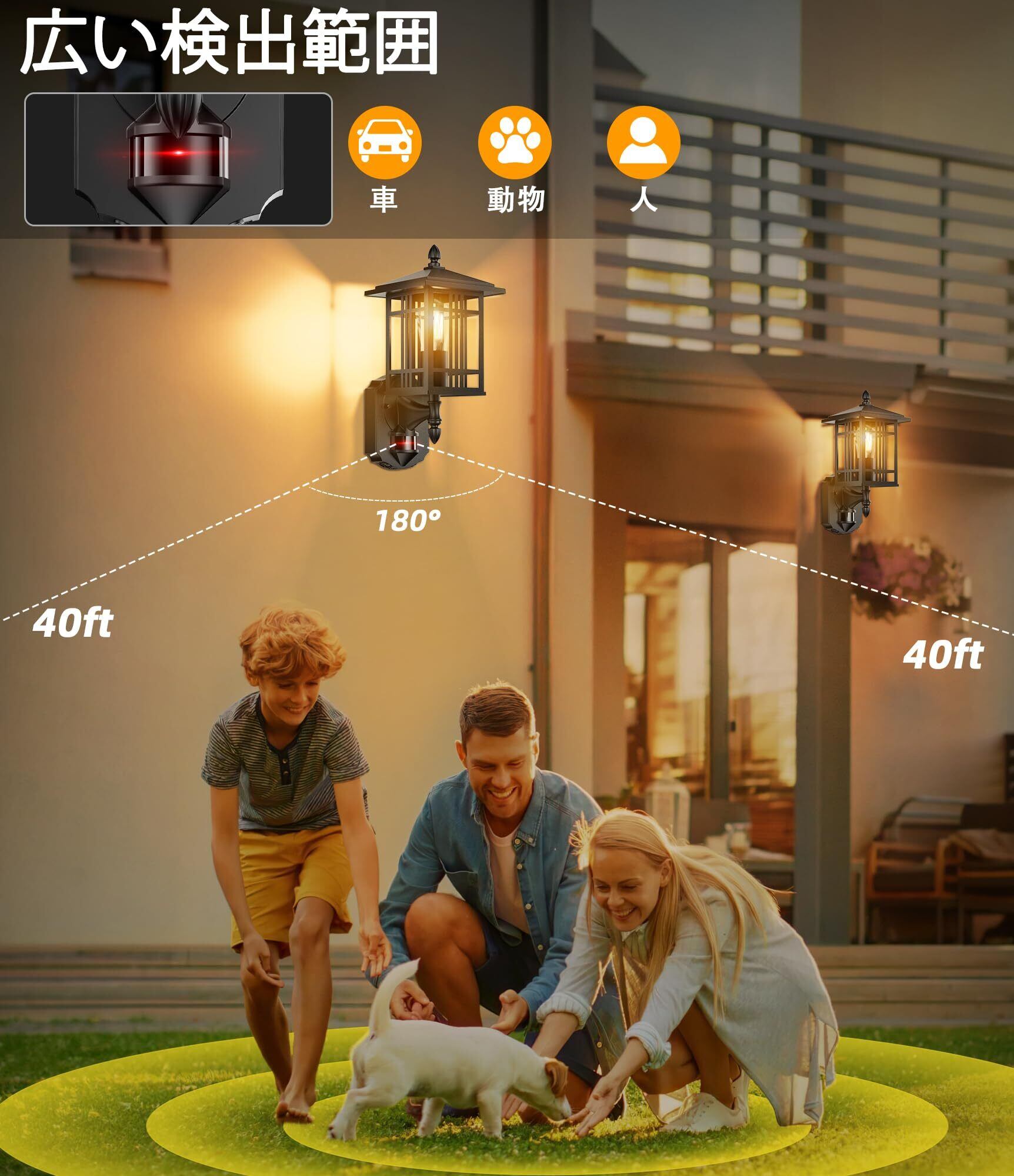 【人感センサーライトと】玄関ライト 人感センサーは180°広い感知角度で広い範囲の人を検知でき、必要な時しか自動点灯しない省エネセンサーライトです。外灯 屋外 人感センサーのセンサー検知距離が最大9mです、動きがなくなると後消灯になります