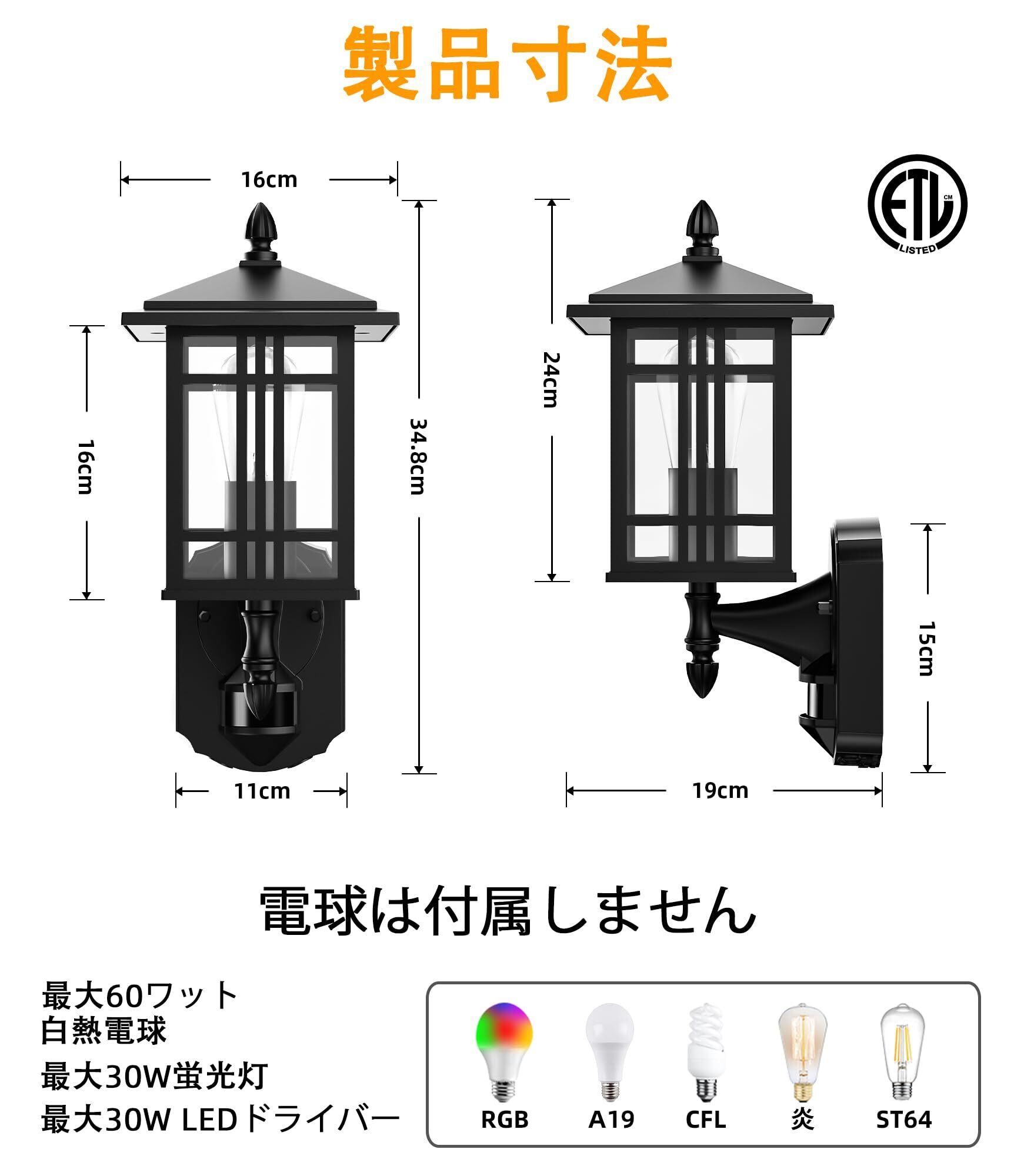 【取付方法】玄関 照明 人 感 センサーは直結タイプのなので、電線接続工事が必要なので、電気専門店や電気店という専門電気技師にご相談してください。玄関灯は防雨型仕様で、悪天候でも耐えるように設計されています