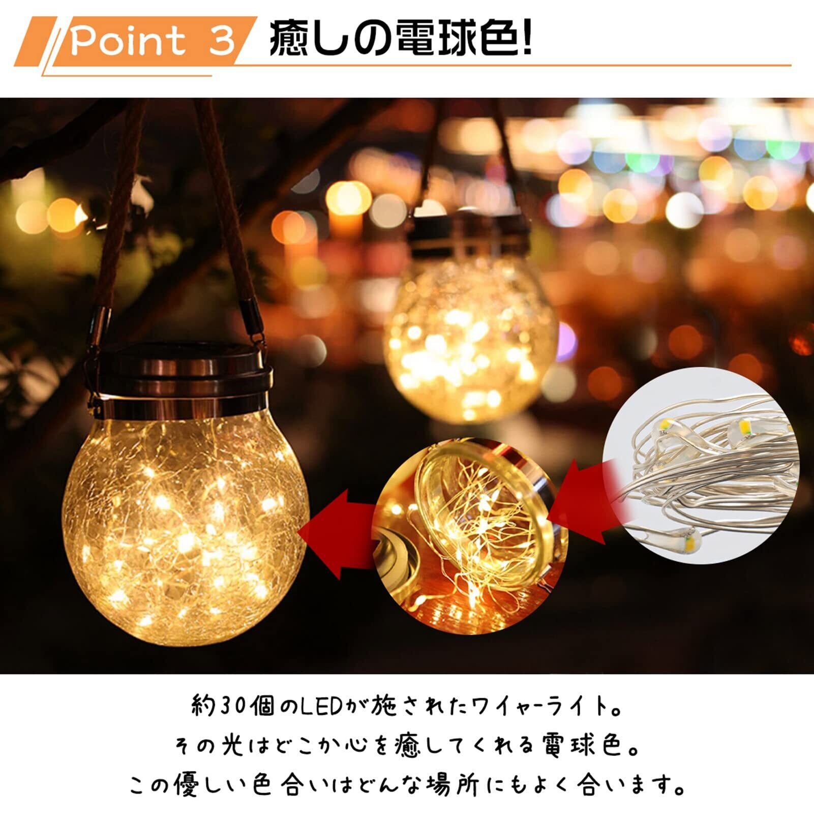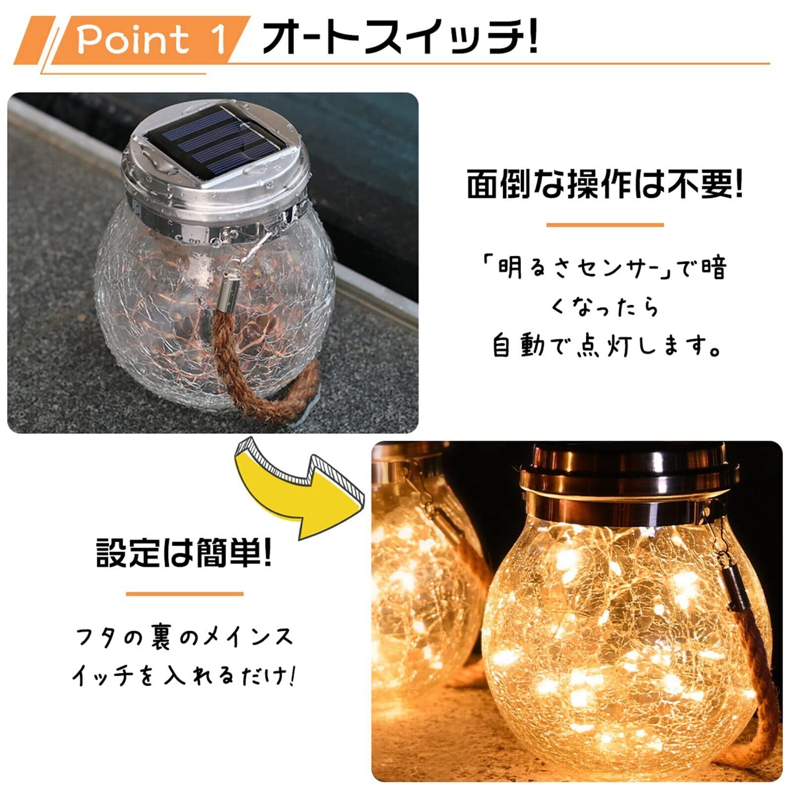 【暖色ソーラーライト】梱包内容:ソーラーライト×2、日本語説明書×1; 充電時間:6-8時間; 照明時間:8-12時間; ※充電時間と照明時間は天候によって変わります ※ご使用する前に必ずスイッチをオンにしてください。