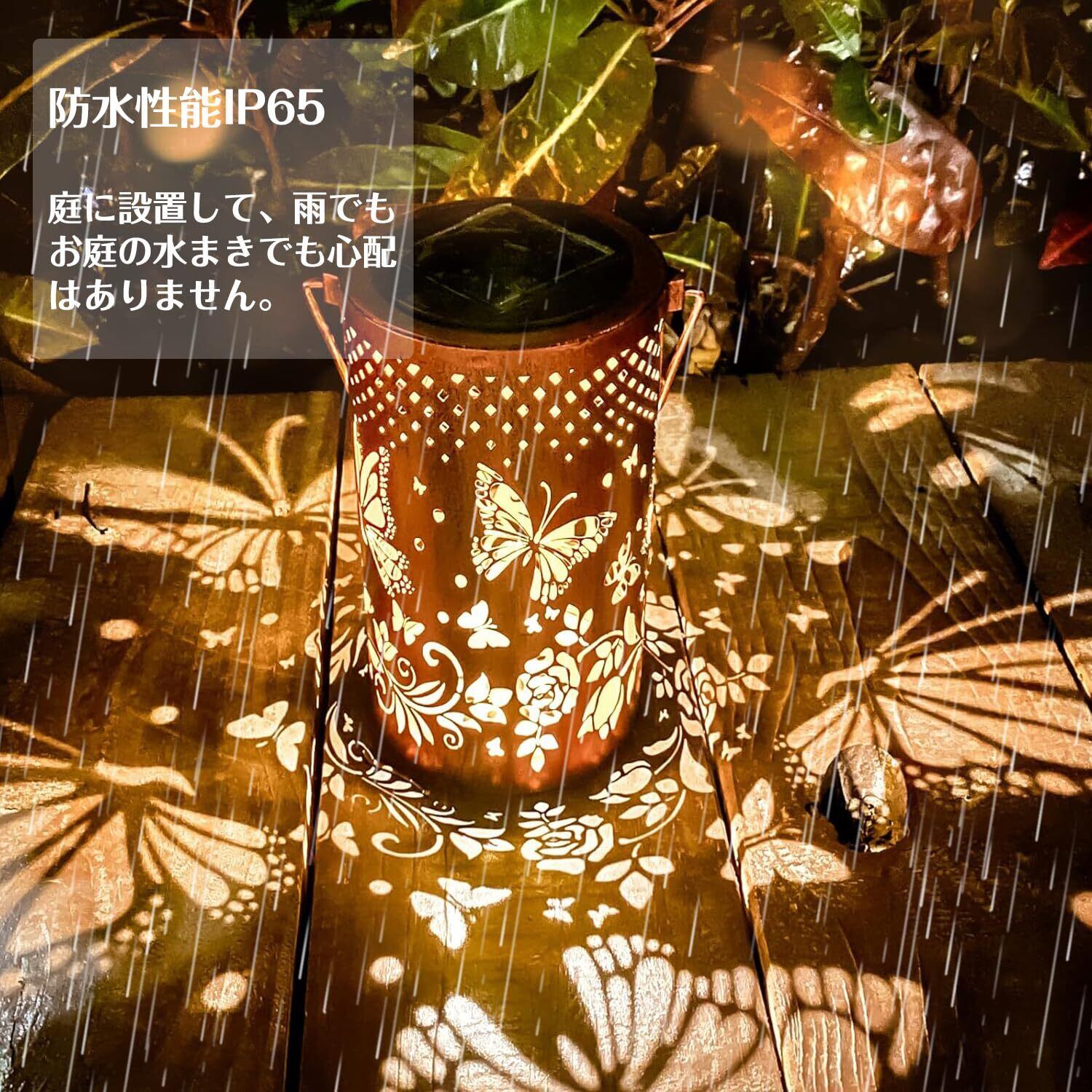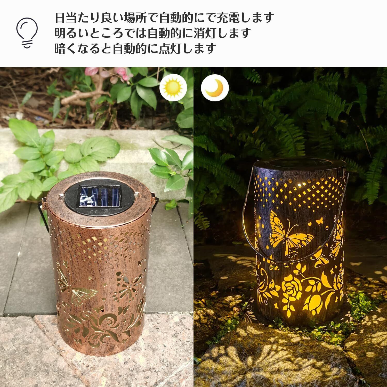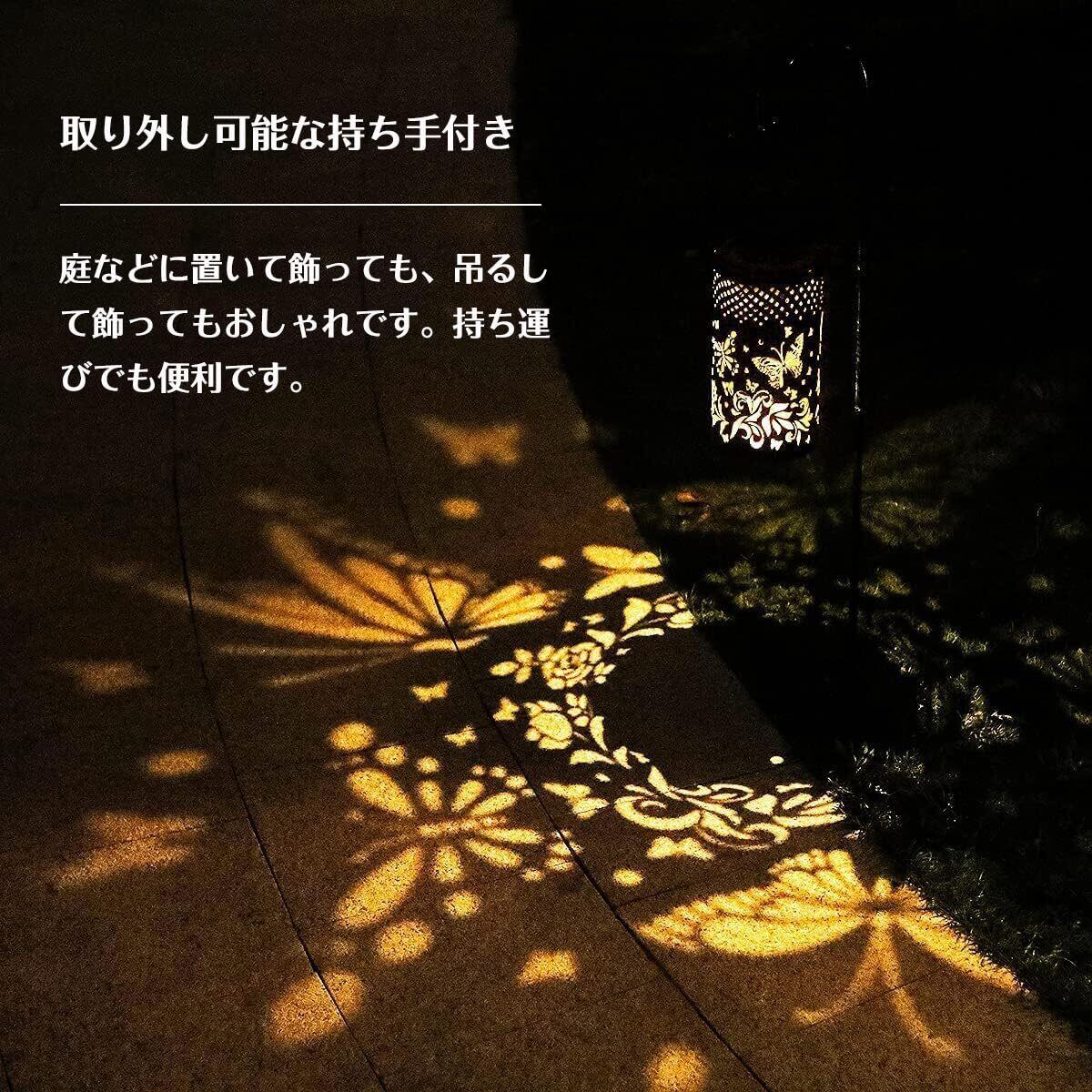 【光と影を楽しむソーラーランタン】外観はアンティーク調で置くだけでおしゃれになります。透かし彫り設計で、暗くなると蝶と花の柄から光がこぼれ、幻想的な光と影を演出してくれます。夜の庭をより美しい雰囲気にライトアップできます。
