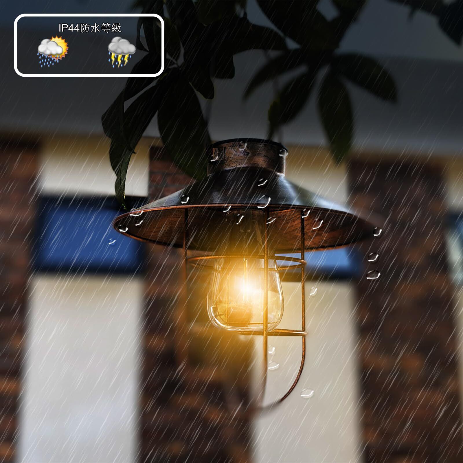 【防水仕様・取付簡単】IP44の防水仕様で、中庭や玄関の装飾照明として中庭の木やブラケット、チェーンなどに吊るしても安心です。雨が降っても晴れても、太陽光が十分にあれば充電がより多くなり、点灯時間が長くなります。