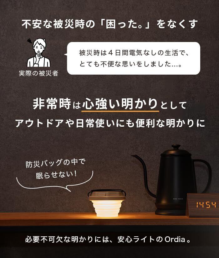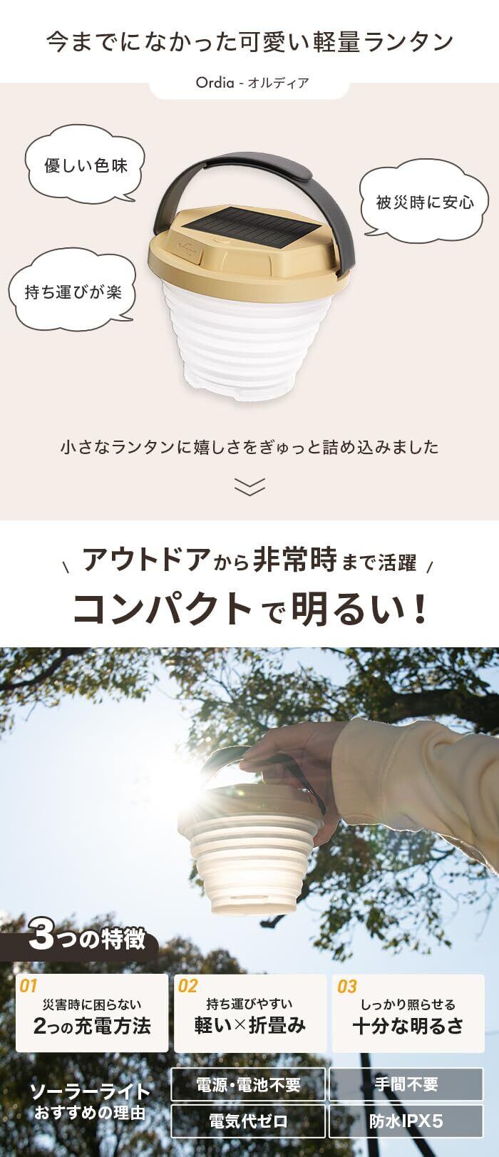 もしもの備えにも!コンパクト&高性能なソーラーランタン「Ordia(オルディア)」。USBとソーラーの2つの方法で充電が可能で、最大24時間の長時間点灯も。防水IPX5仕様で、雨の日でも安心して使用できます。明るさは3段階調光ができ点滅モードも選べで、キャンプ利用はもちろん非常時の夜間避難や非常灯にもぴったりです。折りたたみ仕様で非常に軽いので携帯性も抜群です。インテリアにも馴染むボディーカラーと優しい暖色系の光、日常的に使いやすいLEDランタンです。