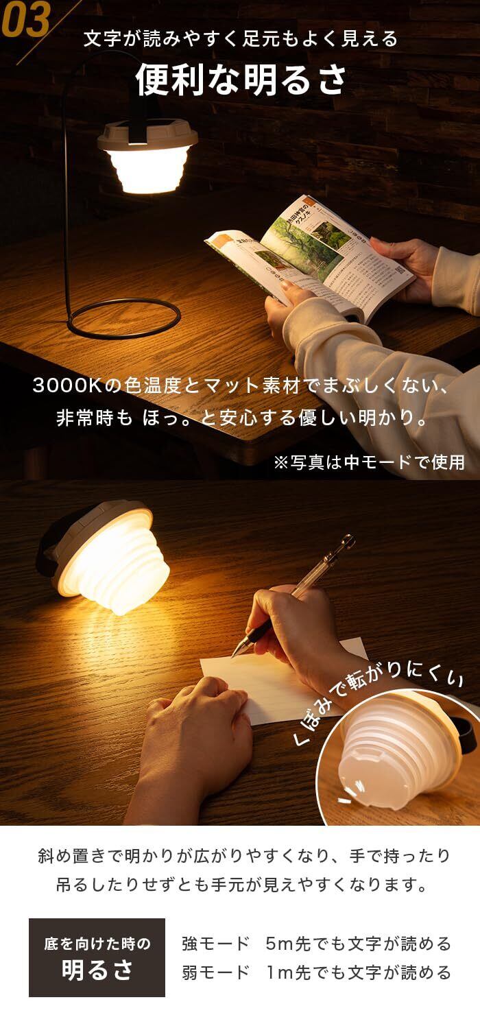 吊り下げもできるシンプル&ナチュラルデザイン:マジックテープバンド付きで簡単に吊り下げ可能。ナチュラルカラーでシンプルなデザインなので室内利用もOK、暖色系(3000K)の優しい光が空間をやさしく照らします。