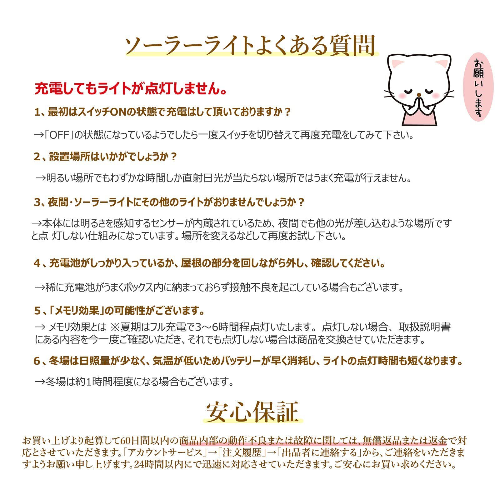 【自動点灯・手間いらず】 照度センサーを内蔵しているので、スイッチトグルNO, 暗くなるとLEDライトが自動で点灯、明るくなると消灯します。ソーラー充電するのでスイッチを入れる。《ご使用になる前に》スイッチONの状態で、直射日光の当たる場所に8時間程度置き、十分に充電してからお使いください。《点灯について》室内や明るい場所で点灯させる場合は、パネル部分を覆って光を遮断してください。
