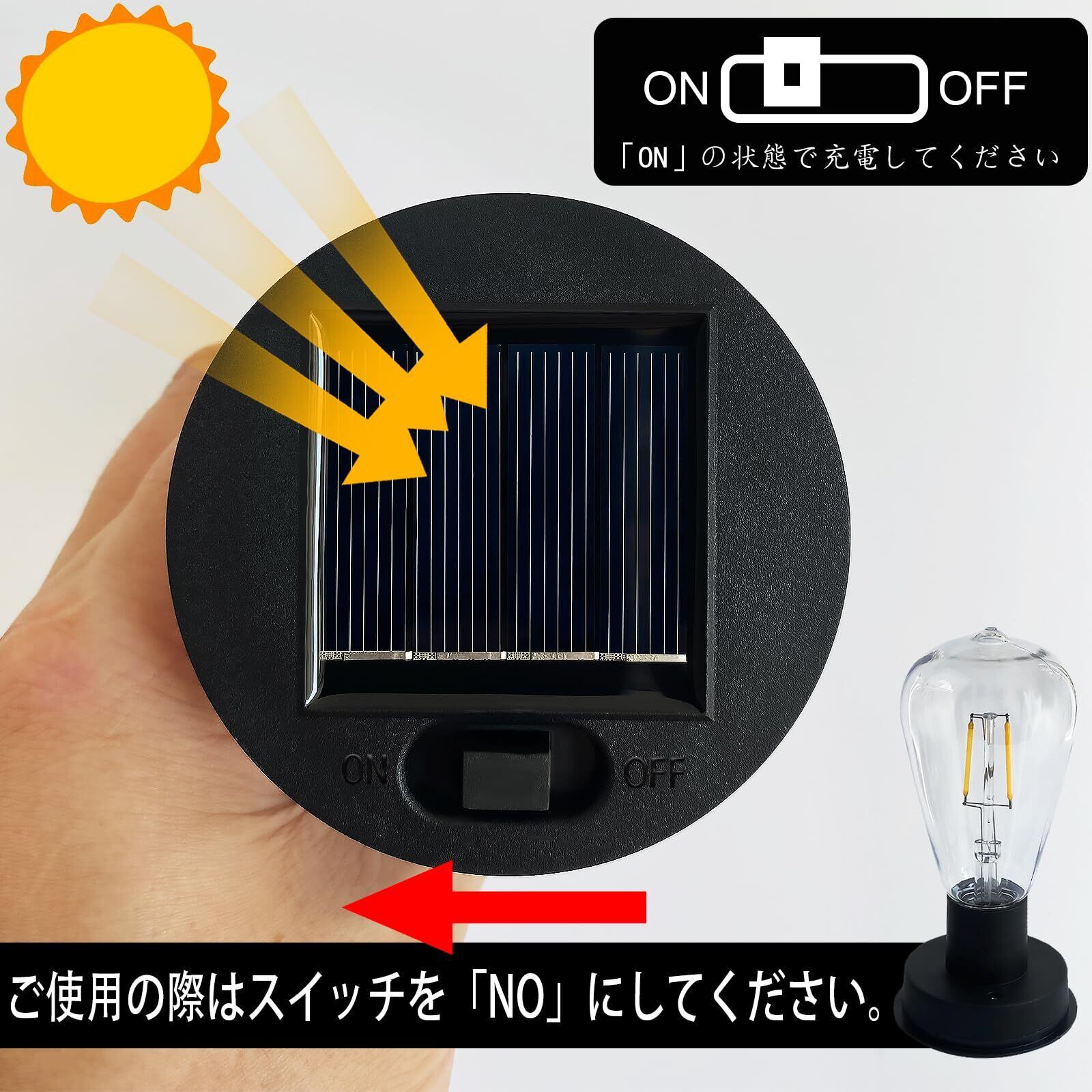 【正しくお使いください】 OFFは全閉です。ご使用の際はスイッチを「NO」の位置にしてご使用ください。暗くなると自動で点灯し、電池がなくなると消灯します。充電する際も「ON」の状態で充電してください。スイッチを入れて「NO」の位置にしてください。暗い場所で点灯しない場合は、「ON」の状態にして太陽光に当てて充電してください。バッテリーが完全に充電された後は、通常どおり使用できます。