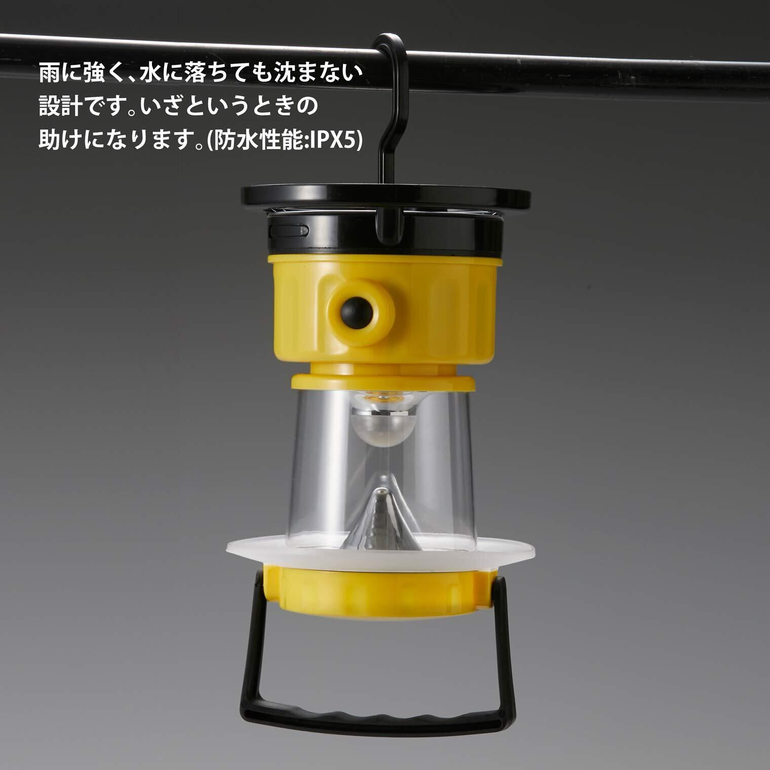 水害対策用の防災ランタン/本格的な水辺のアウトドア用として開発したのが本製品「ALA-3406 水に浮くLEDランタンライト」です。台風レベルの強い雨風の中でも耐えられるIPX5の防水性能かつ、約110ルーメン(lm)の明るさで周囲を明るく照らします。底部には可動式フックを実装しているので、キャンプの際にテント内で吊るしたり、停電時にはカーテンレールにかけて室内照明として活躍します。