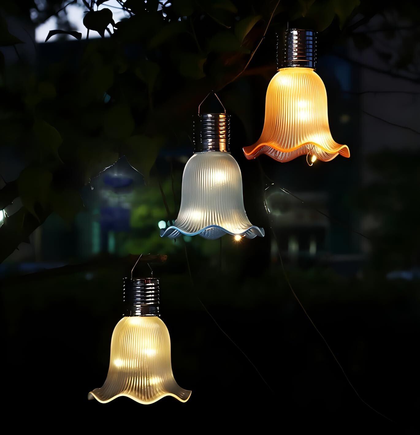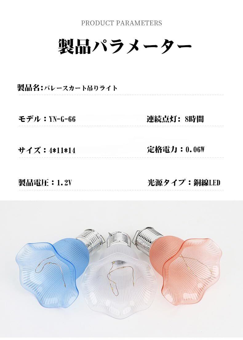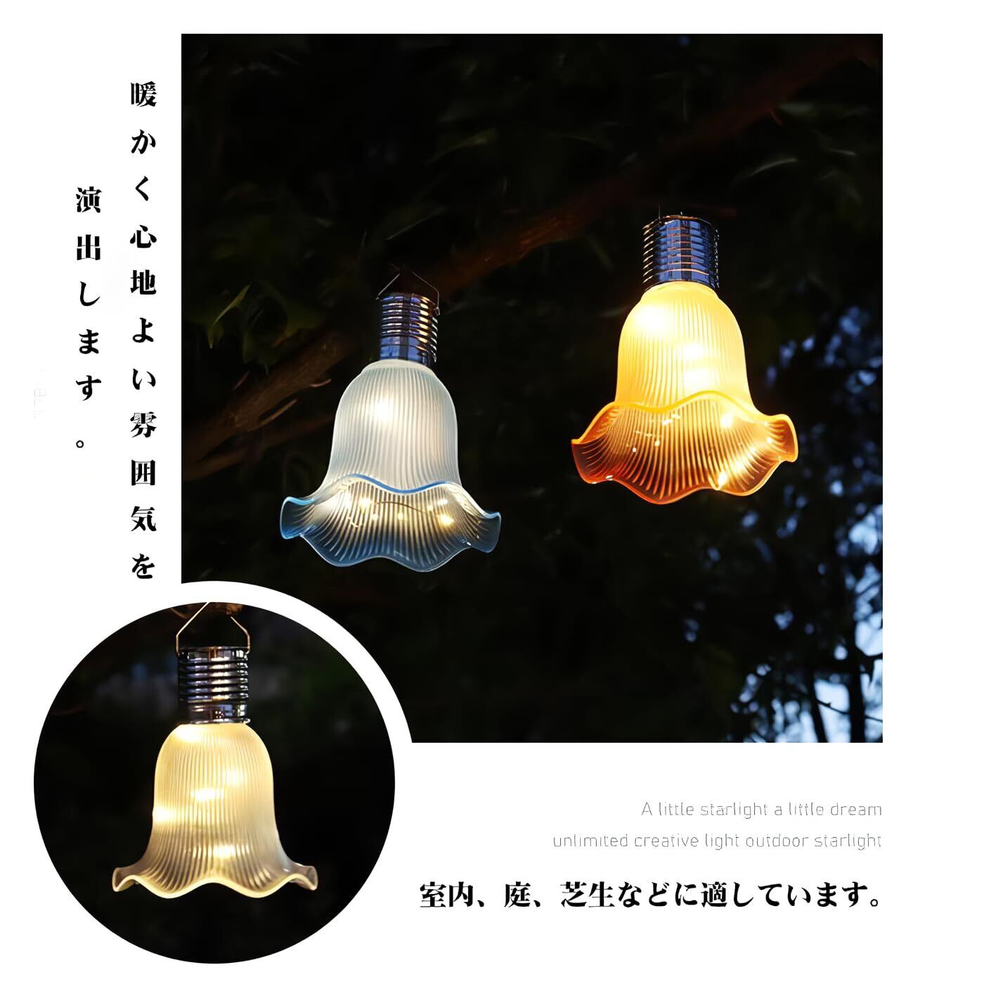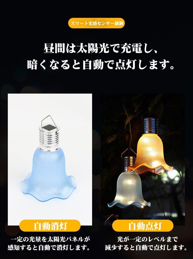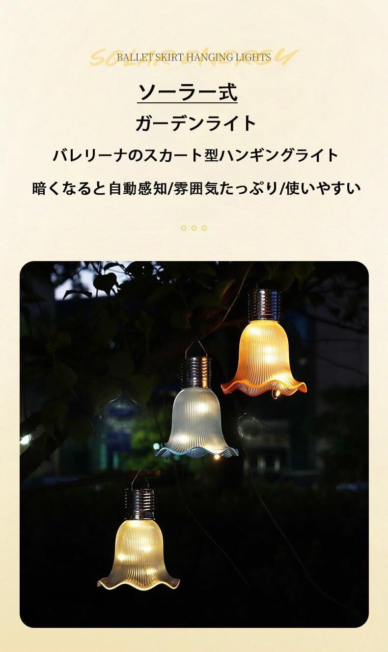 こちらは、ソーラー式のガーデンライトです。バレリーナのスカートを模した優雅なデザインで、暗くなると自動で点灯し、雰囲気を盛り上げます。太陽光で充電し、手間のかからない操作で、庭やベランダに最適です。柔らかい光が広がり、温かみのある空間を演出します。