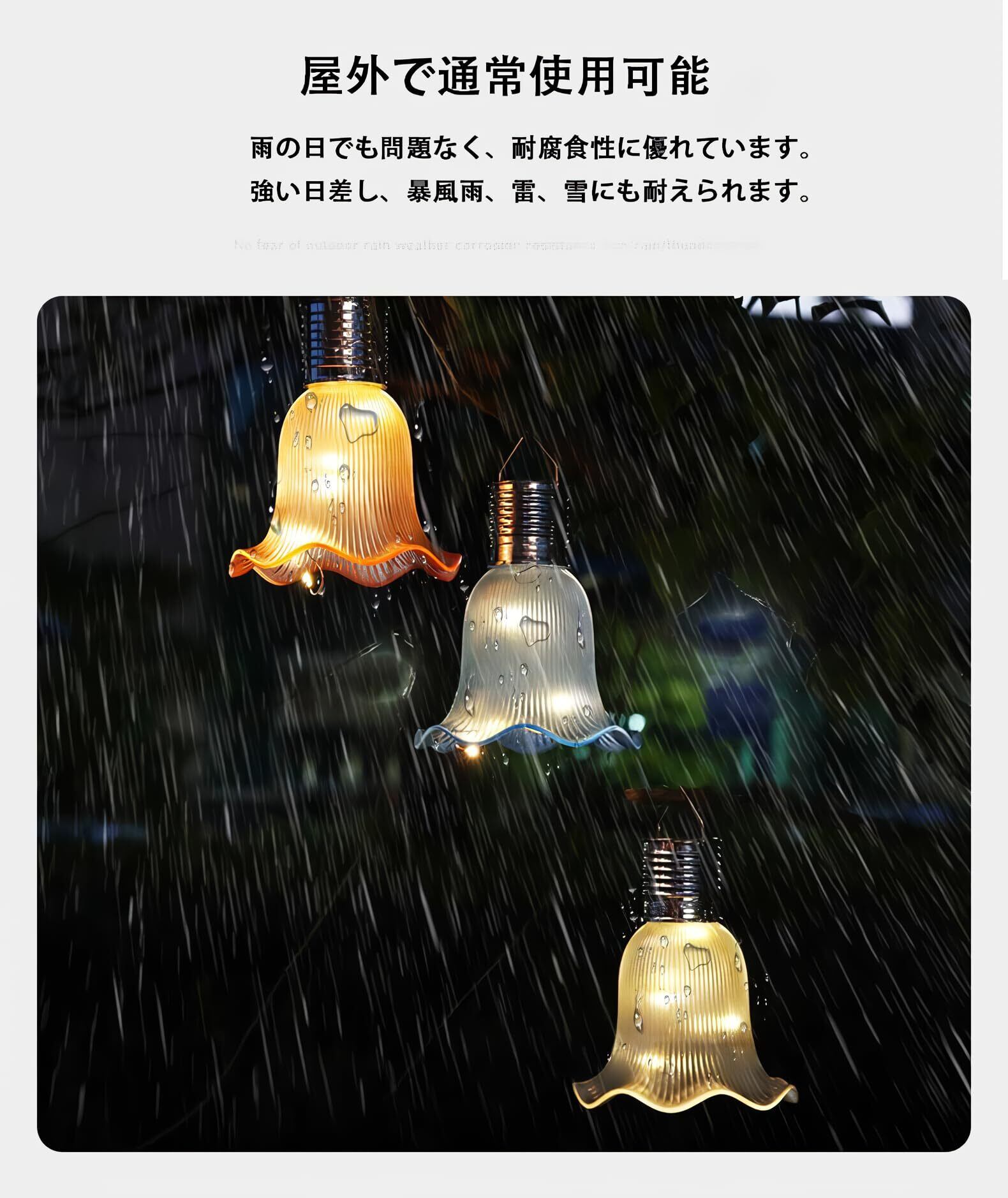 ソーラー式ガーデンライトは、屋外での使用に最適です。雨の日でも問題なく、耐腐食性に優れているため、強い日差しや暴風雨、雷、雪などの過酷な天候にも耐えることができます。デザインは美しく、夜には優しい光で庭を照らし、落ち着いた雰囲気を演出します。