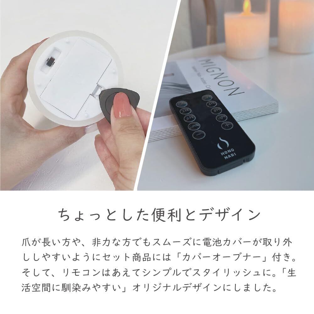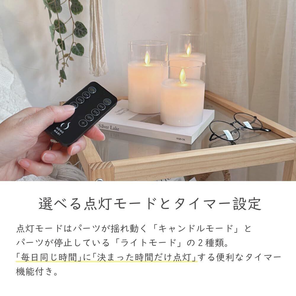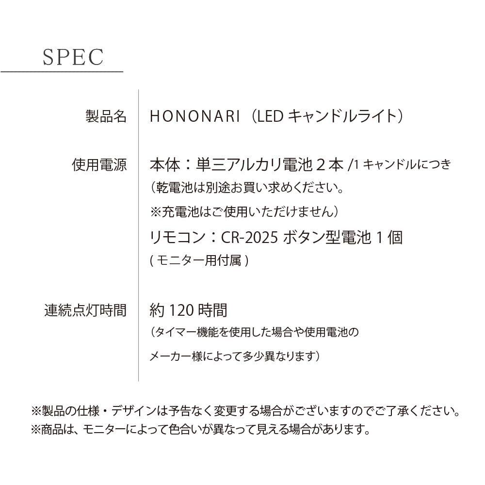 【火を使わないキャンドル】お子様やペットがいるご家庭でも、気軽に火の心配がなくご使用いただける電池式です。 観葉植物や本棚などの近くにも置けるのでインテリアの幅が広がります。【本物のロウを使用】見た目や質感もしっかり味わっていただくために、HONONARIシリーズはすべて本物のロウを使用しています。