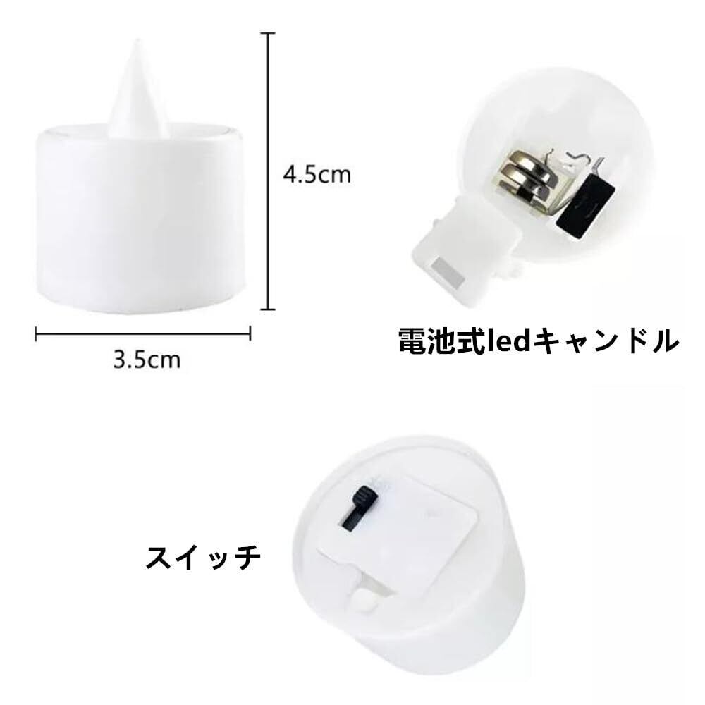 【仕様】LED + PP ;サイズ:直径約3.5cm 高さ約4.4cm;LEDキャンドルライト*24個。電池で光るキャンドルライトは繰り返して利用できます。また、電池式で置き場所を選ばず、玄関や窓際、リビングテーブルの上、ベッドサイドなど、様々な場所で使えます。