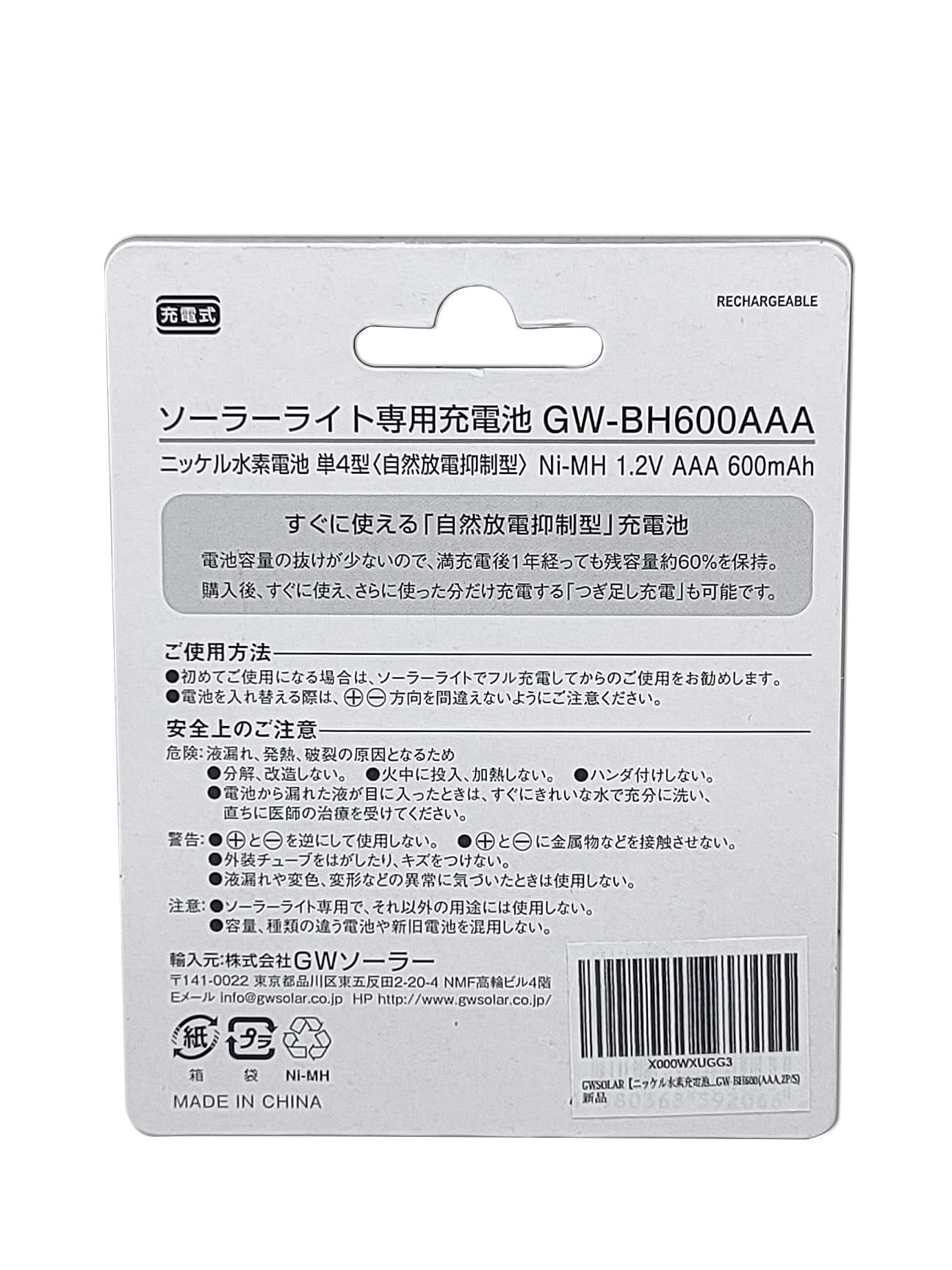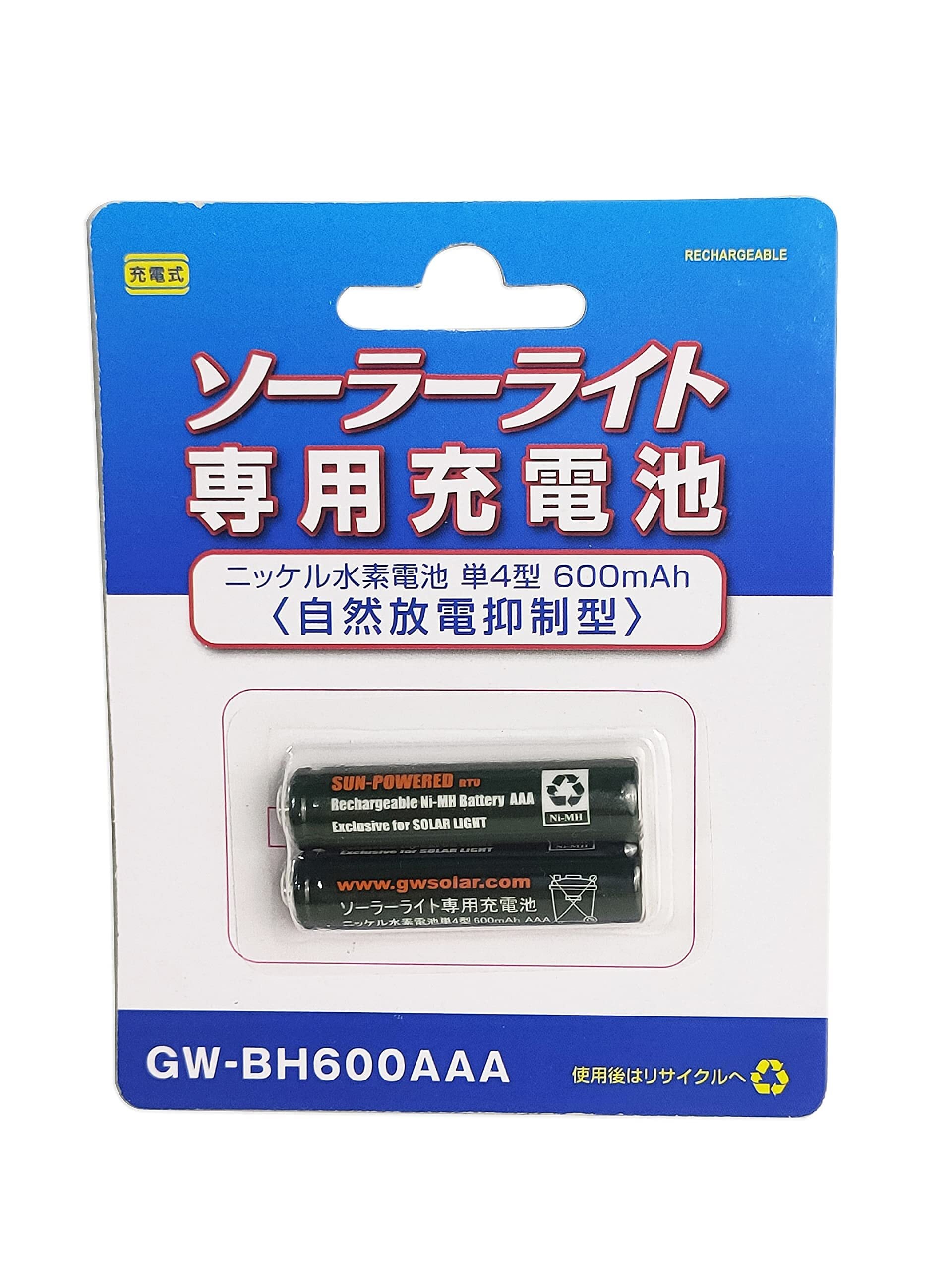 GWSOLAR ソーラーライト用充電池2本セット 単4形 充電池 単4 ガーデンライト 照明【自然放電抑制型・ニッケル水素充電池 600mAh】GWソーラー 型番:GW-BH600(AAA,2P/S)