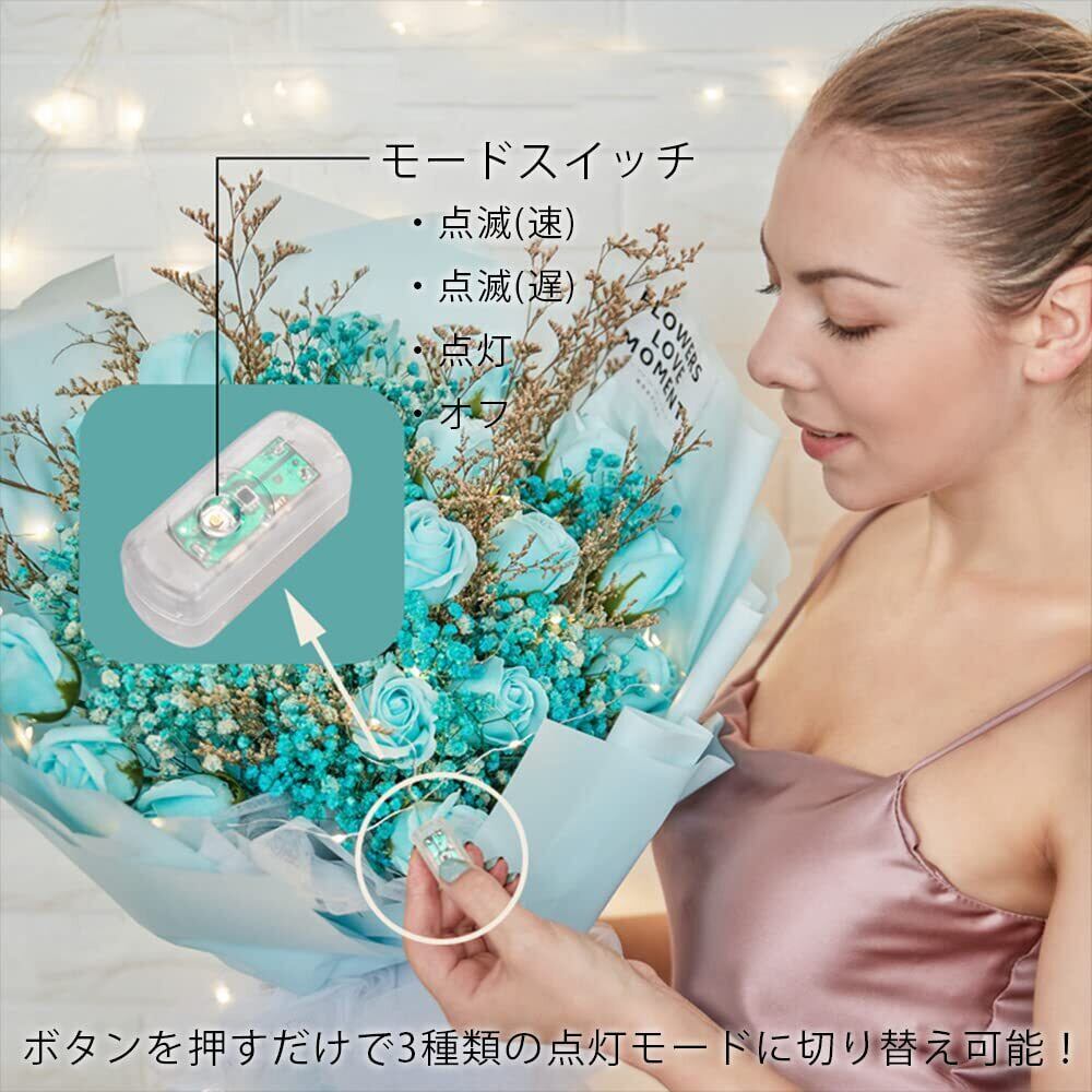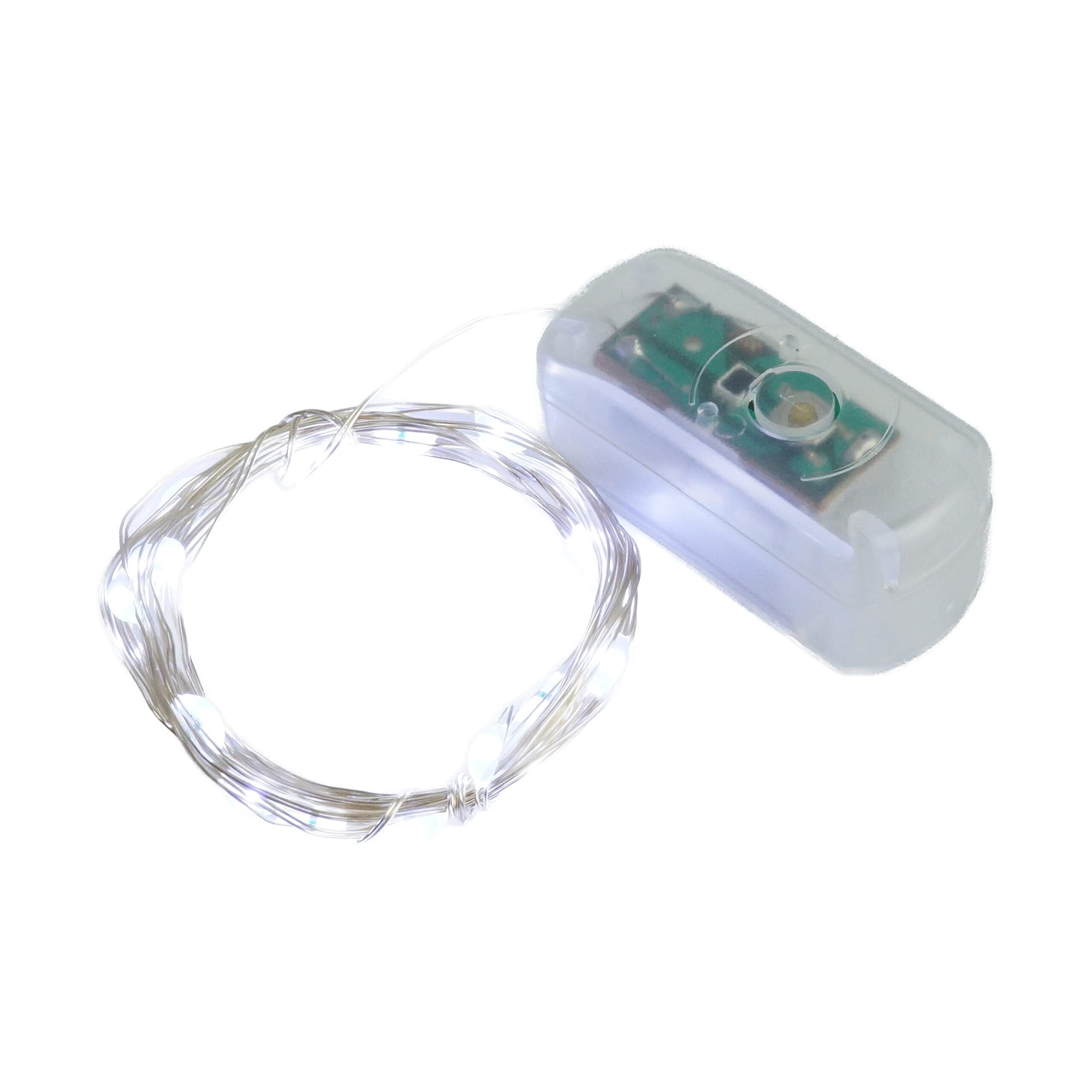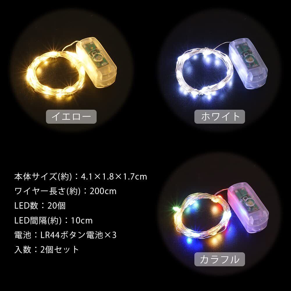 本体サイズ(約):4.1×1.8×1.7cm ワイヤー長さ(約):200cm LED数:20個 LED間隔(約):10cm 電池:LR44ボタン電池×3 入数:2個セット