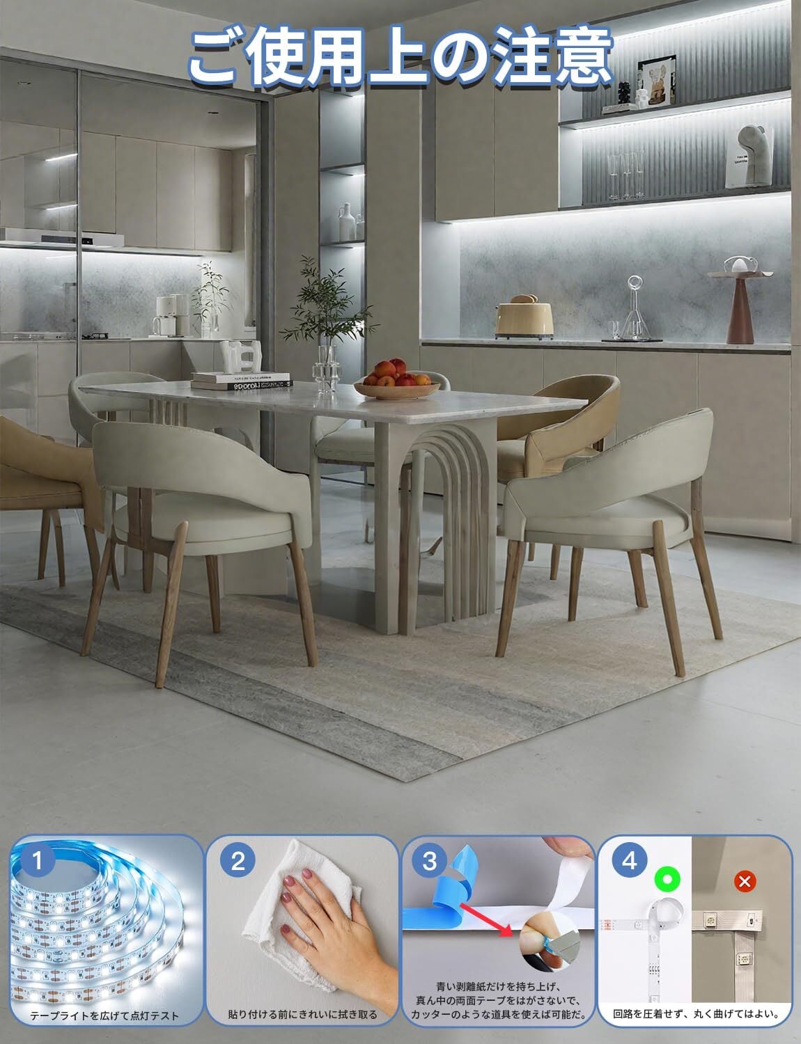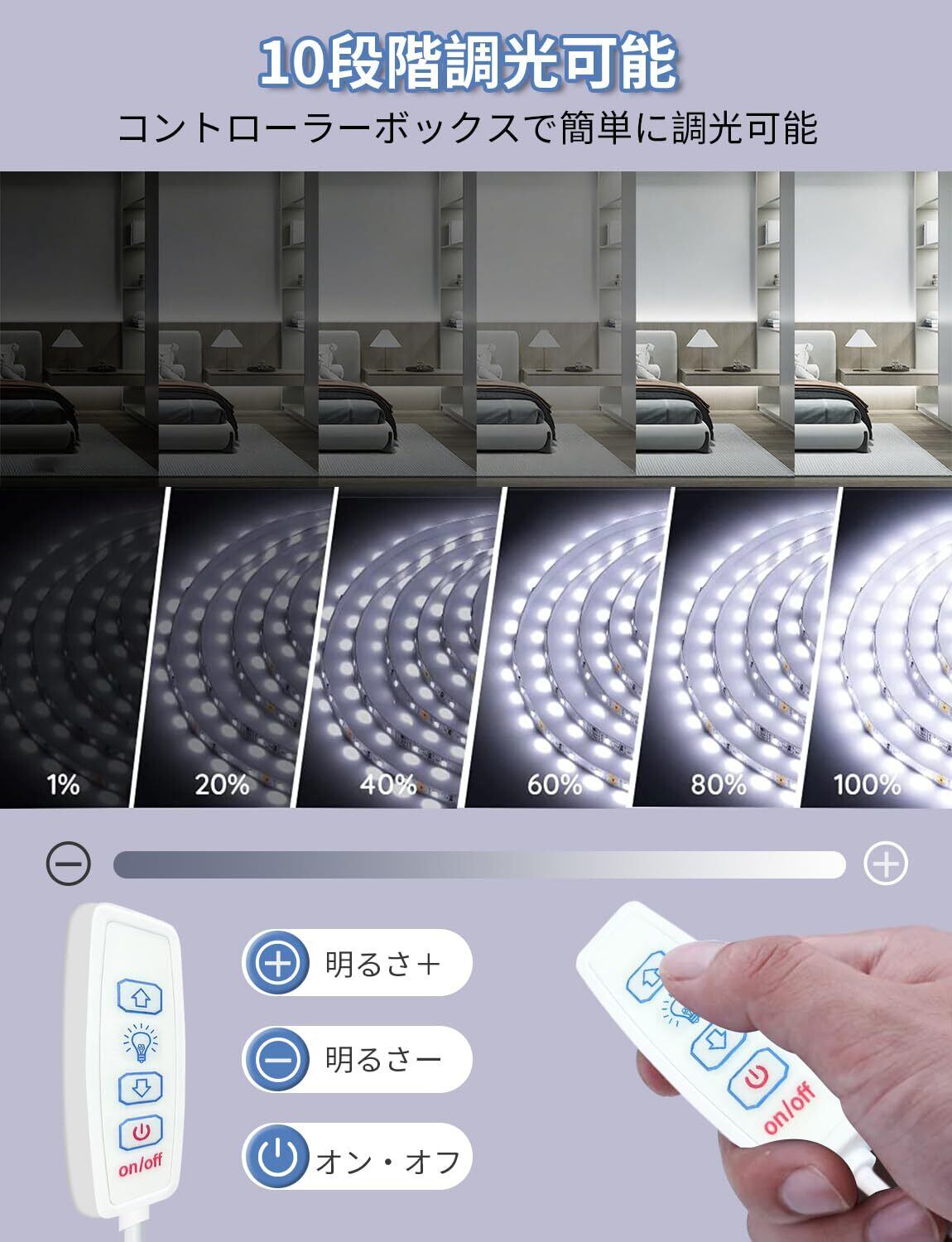 【10段階調光・調光ボタン付き】専用調光器で、幅広く細やかな色温度を調整できます。調光ボタンは簡単に操作し、子供にも使えます。※リモコン付属しておりません。本品は非防水屋内用テープ ライト LED、当店は他の防水バージョンもありますので、ショップで防水を検索するか、カスタマーサービスにご相談いただけます。