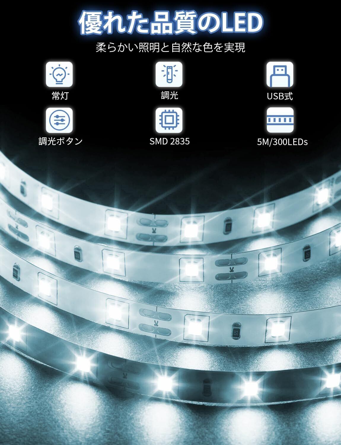 LEDテープライト5M 昼光色 グレードアップ USB式 300LEDs 薄型軽いライン状 LEDテープ 5V 10段階調光 間接補助照明 寝室/子供部屋/キッチン/リビングルーム/キャビネット/祭りイベントタープテント 臨時照明器具LEDランプ 非防水室内装飾用 ストリップ テープライト