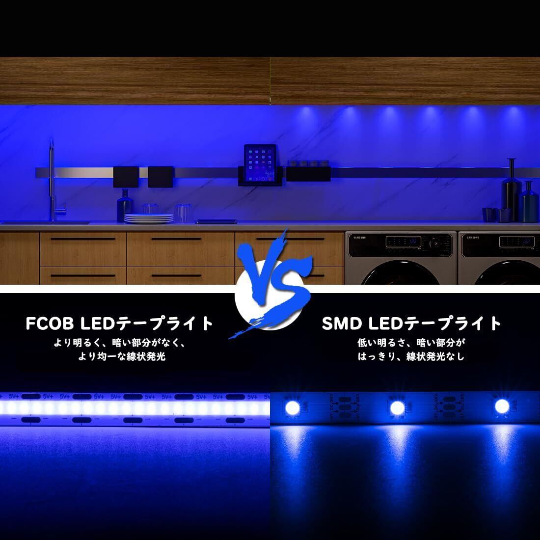 「安全に使用でき」 通常のLEDテープライトよりも柔らかく均一な光で、目にも安全です。 発色指数が高くて、照明効果がいいです。紫外線や赤外線、水銀、鉛などの重金属を含まず、環境にやさしいです。真の二層FPCB基板を採用したFCOB LEDテープライトは、他のテープライトよりも放熱性に優れ、子供やペットにも安全です。