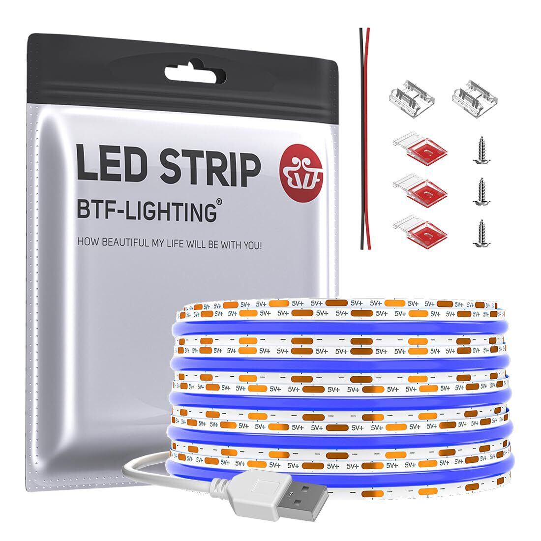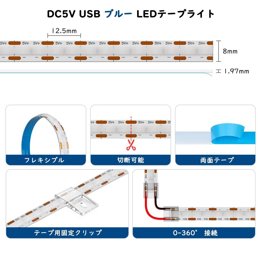 BTF-LIGHTING FCOB COB LEDテープライト USBライト 高密度 フレキシブル LEDテープライト 1M 320LEDs/m ブルー 青色ライト 幅8mm ストリップライト DC5V USB 6W/m 調光可能 変形可能 切断可能 寝室 キッチンホーム 屋内装飾 エネルギークラス A+++ 非防水 FOBライト CRI>85 コントローラーがない | KSショップ