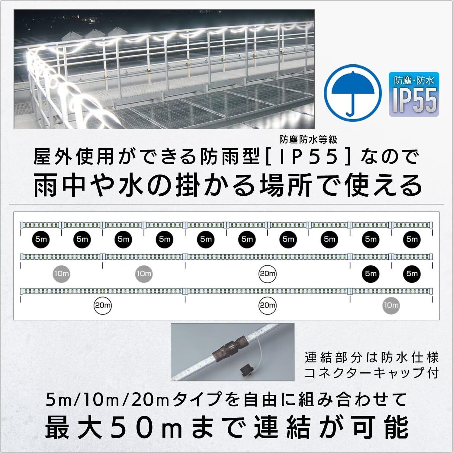 その他特長:屋外用防雨型(防塵・防水等級「IP55」)、アース不要の二重絶縁構造、最大50mまで連結可能、屈曲に強い優れた耐久性(耐衝撃保護等級「IK10」)