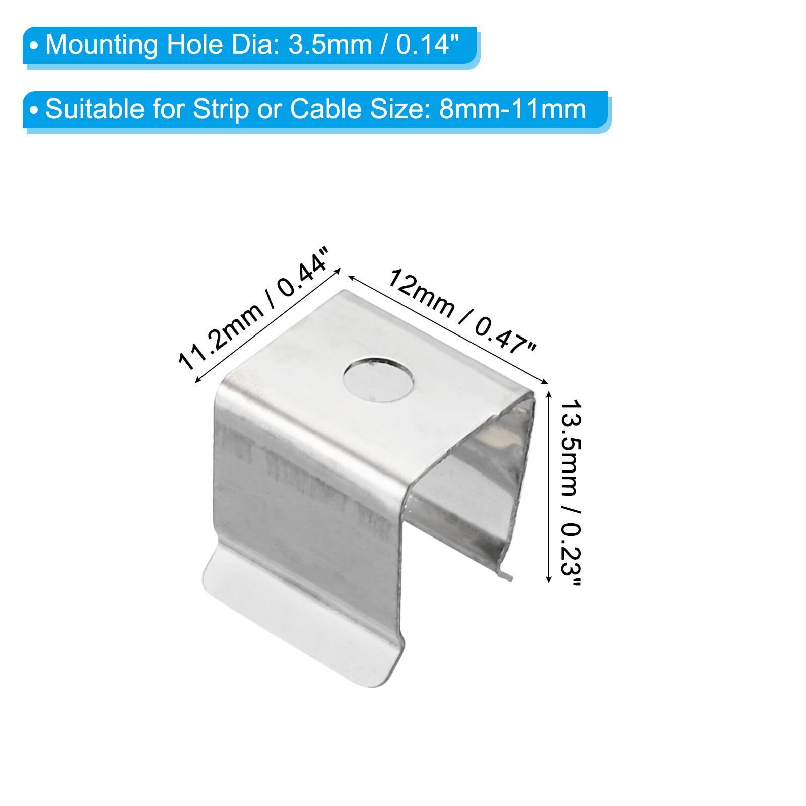カラー: シルバー; 材質: ステンレス鋼; 合計サイズ:12mm x 13.5 mm x 11 mm/ 0.47"x0.53"x0.43"; 内幅:10.8 mm; 最適なストリップまたはケーブルのサイズ:8 mm-11 mm; 取付穴径:3 mm; ネジのサイズ:M2x10 mm; パッキングリスト: 100個 x LEDストリップランプクリップ、100個 x ネジ