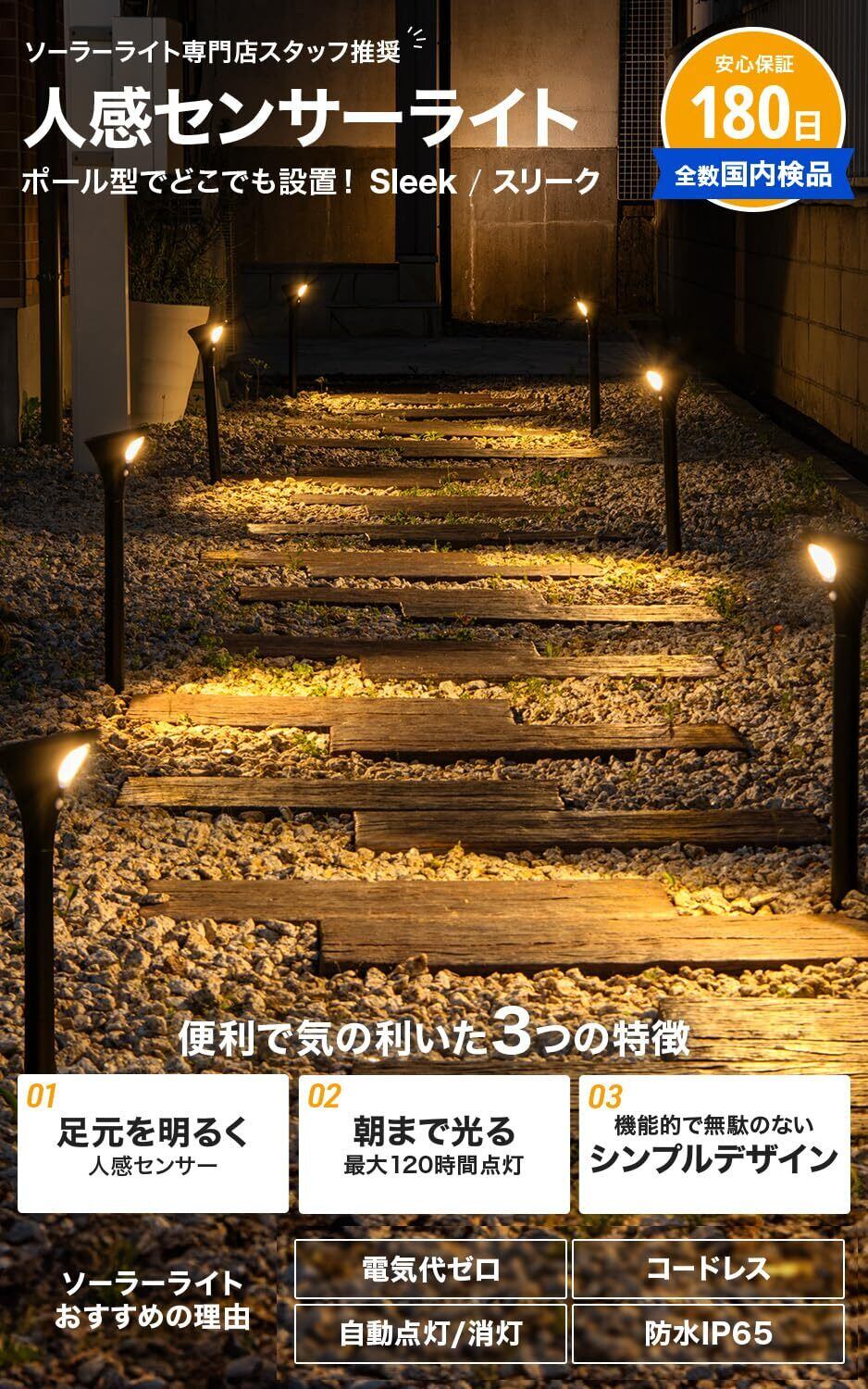HAPPYJOINT スリーク 2本 人感センサーライト ソーラー 屋外 防水 ポール IP65 120時間点灯 高さ調節 暖色