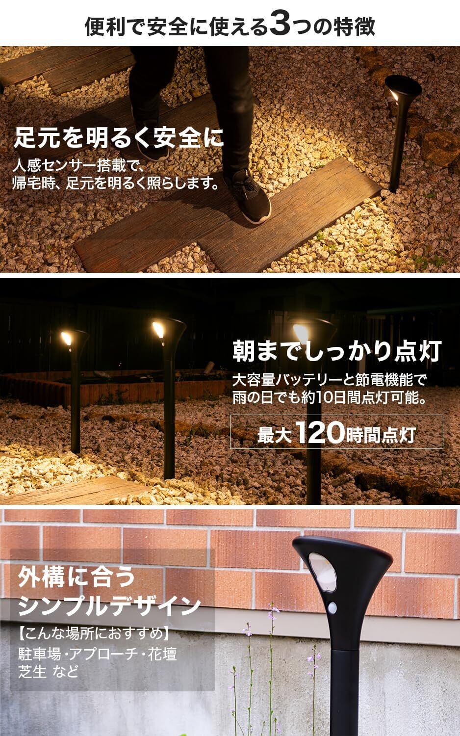 【最長120時間点灯で雨の日も光る】長時間点灯を実現した人感センサー付きのポールタイプのソーラーライト。雨天が数日続いても朝まで明るく照らします。