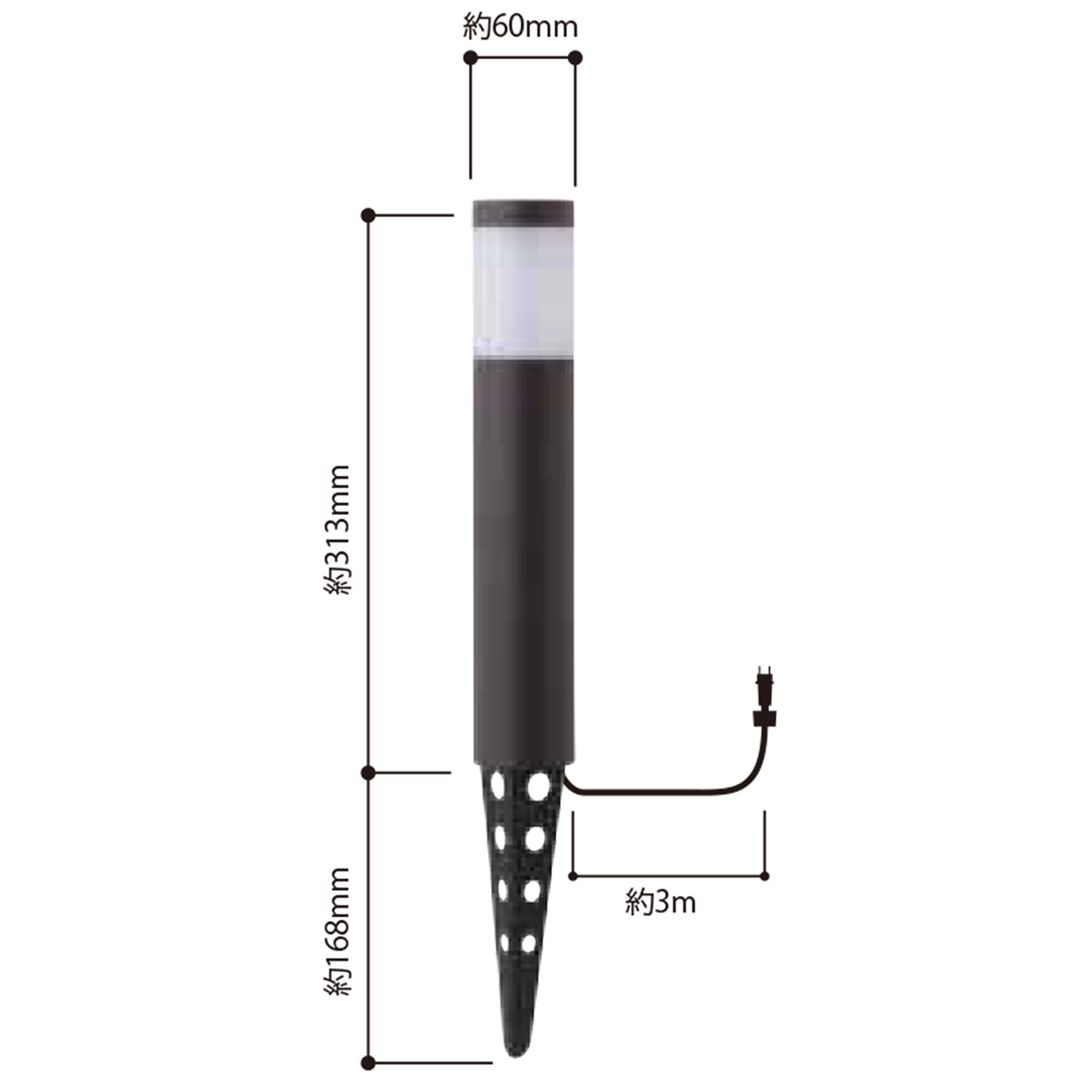 本体サイズ:約幅10cm×奥行10cm×高さ23.5cm(高さは地中杭(約10.5cm)を含む)、コード全長:約3m、重量:約0.4kg