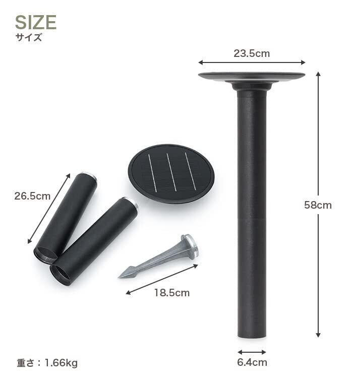 【サイズ・重量】ライト本体 幅23.5*奥行き23.5*高さ58cm、パイル長さ18.5cm、ポール径 6.4cm / 重量1.66kg