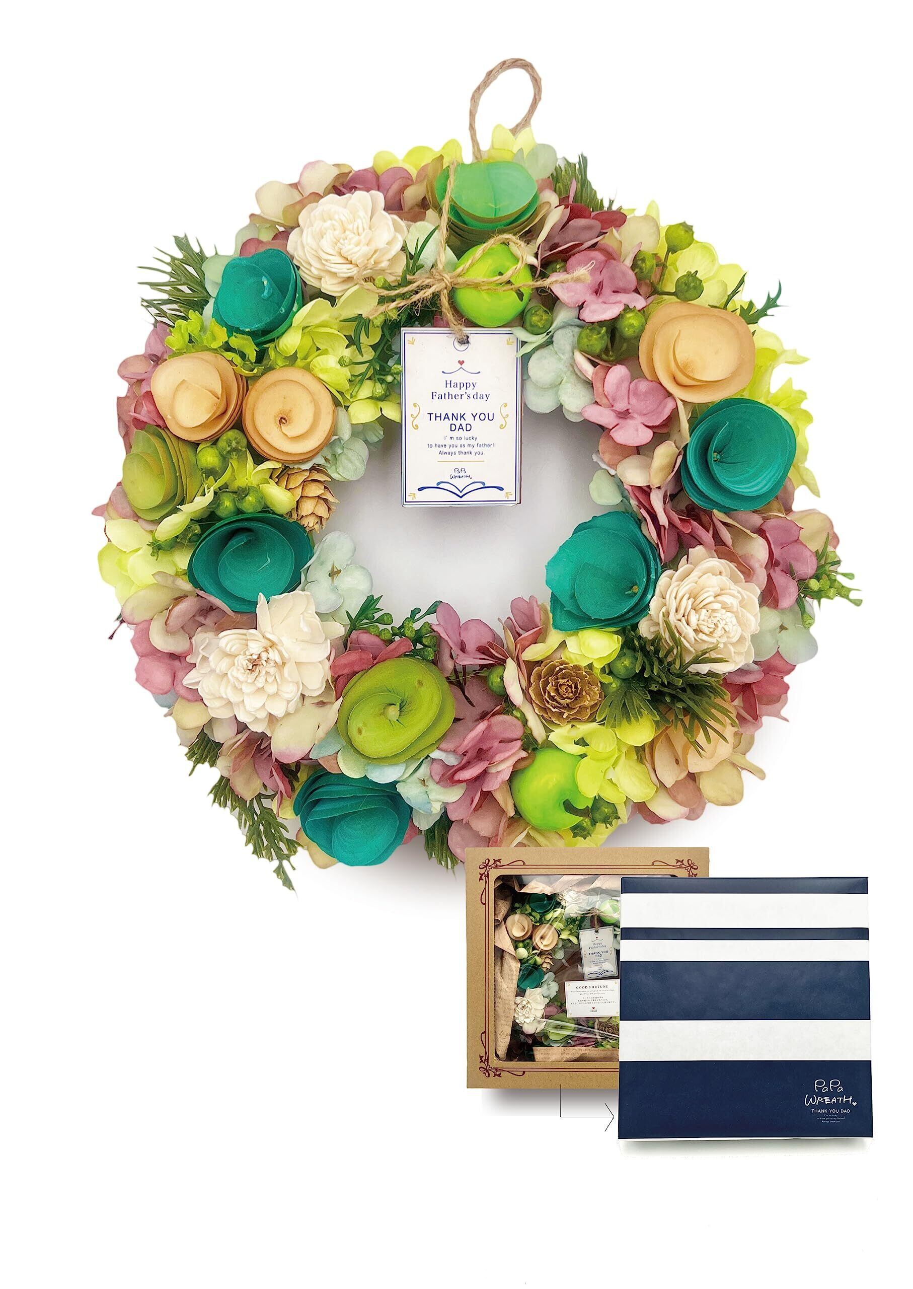 お父さんへ、癒しの時間と「ありがとう」の気持ちを贈りませんか? 本商品は、アーティフィシャルフラワーリースです。中央には「THANKS FATHER」のタグ付きで、父の日の贈り物にぴったり。 男性でも気兼ねなく飾れる落ち着いたカラーとデザインで、リビングや玄関、オフィスのインテリアとしても喜ばれます。