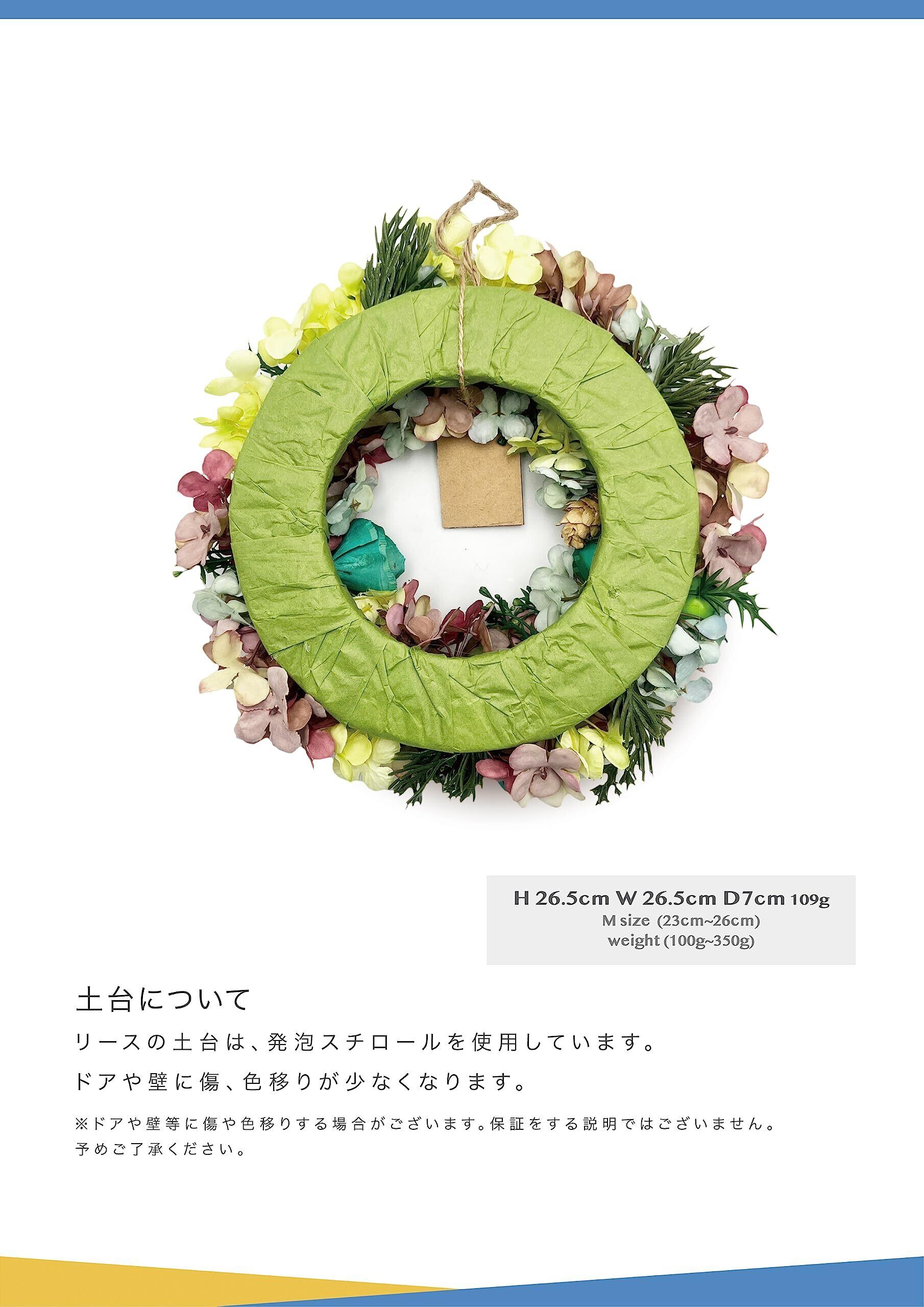 空間の彩りに - - - リースはお家やお部屋のアクセントとして彩りを加えてくれます。 スタンドを使うことによって飾れる場所も増え、下駄箱・テーブル・棚などにも立て掛けて飾れます。お部屋のテーマやコンセプト・インテリアに合わせて飾ったり、あえて調和させずに差し色として飾るのも良いかもしれません。 キレイや可愛いはプラスαの力を与えてくるもの、空間に彩りを加えてみて下さい。