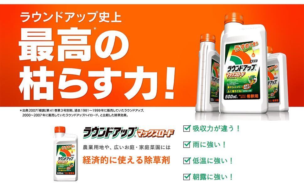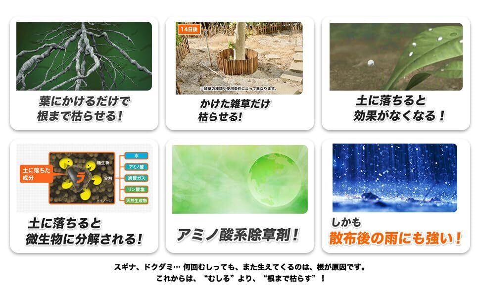 希釈タイプで広い面積に経済的に使える、葉から入って根まで枯らす除草剤